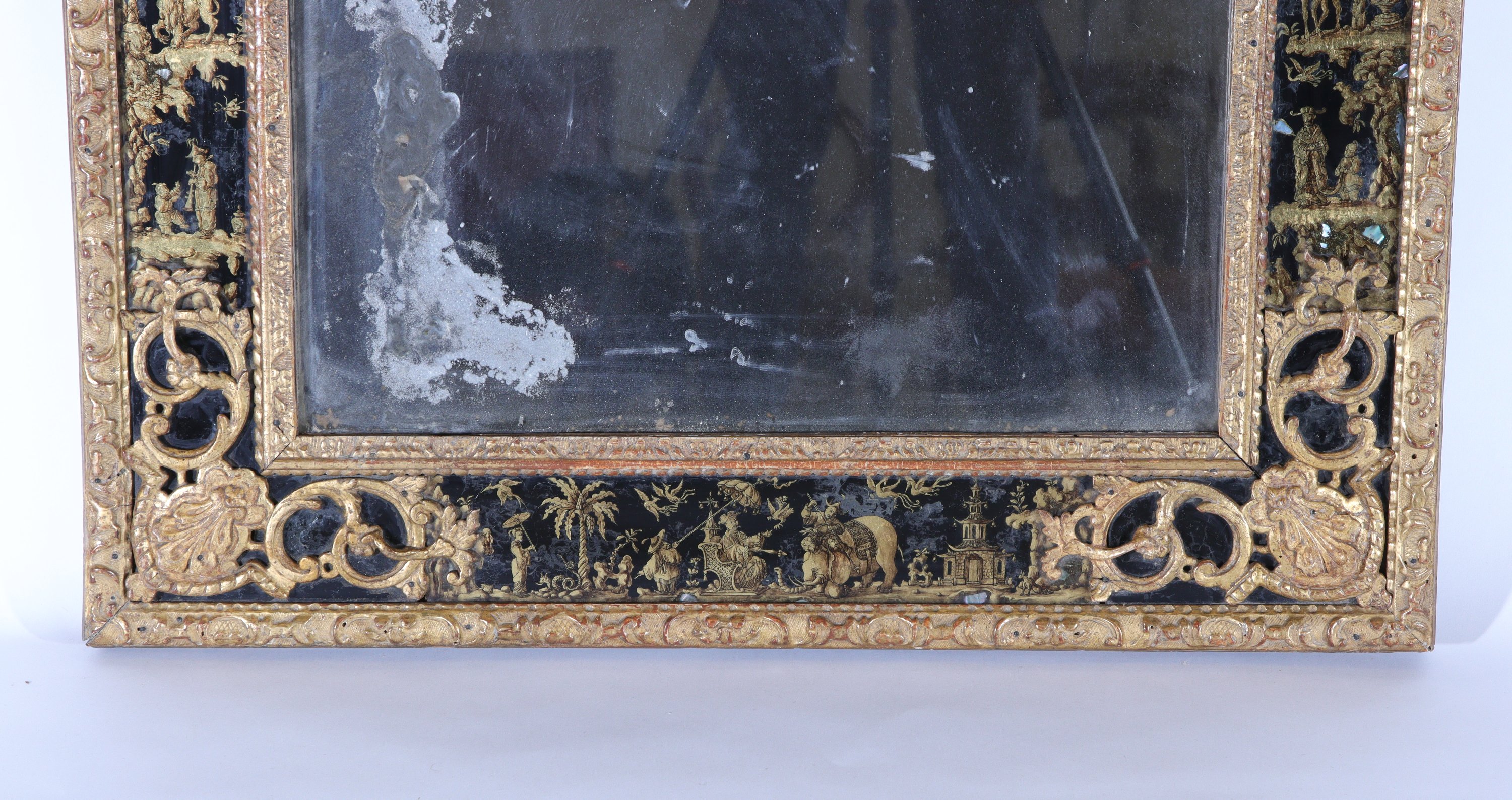en verre églomisé noir et or avec des rehauts de nacre sur une glace au mercure peinte à décor de chinoiseries avec éléphant, pagode, oiseaux mirifiques, scènes de cour et animées, animaux exotiques et palmiers.