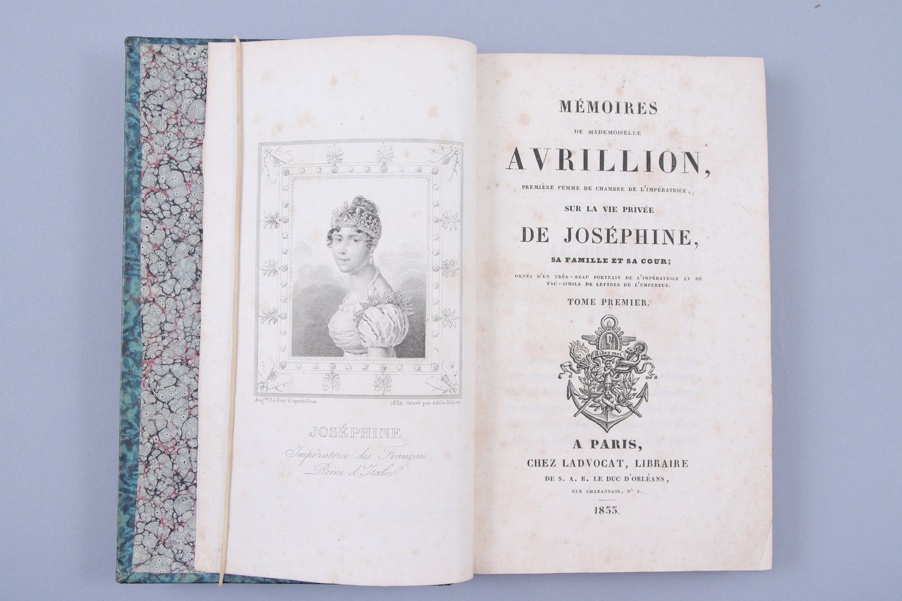 Bon exemplaire de l'édition originale de ces mémoires, oeuvre de Maxime de Villemarest (1784-1852), ancien protégé de Talleyrand. Ils eurent "un succès prodigieux et contribuérent à renforcer la popularité de Joséphine... La reine Hortense jugeait les Mémoires de Mademoiselle Avrillion assez exacts, la femme de chambre de Joséphine ayant dû collaborer avec Villemarest. Ces mémoires sont à Joséphine ce que les mémoires de Constant sont à Napoléon..." (Tulard 54)