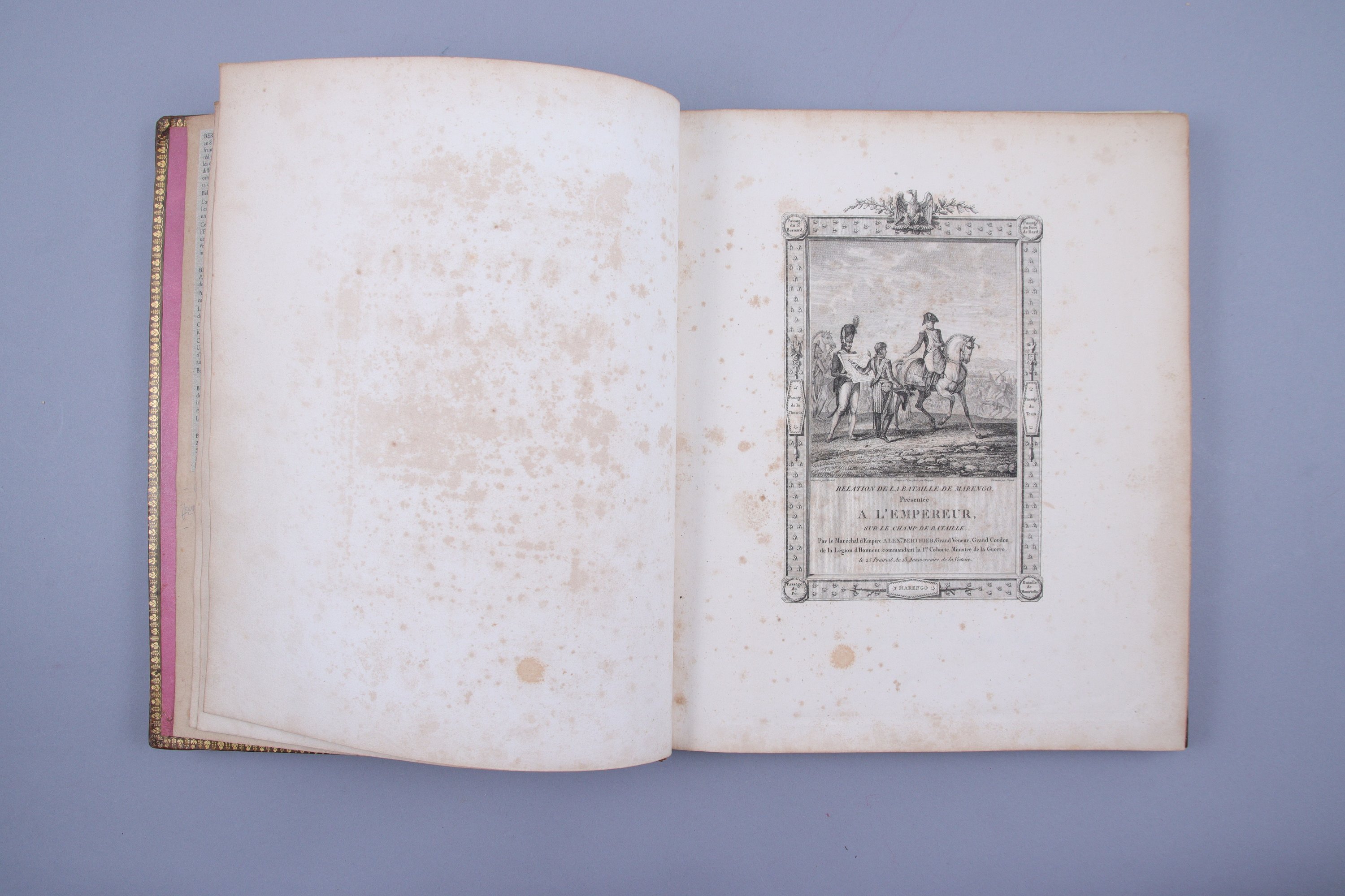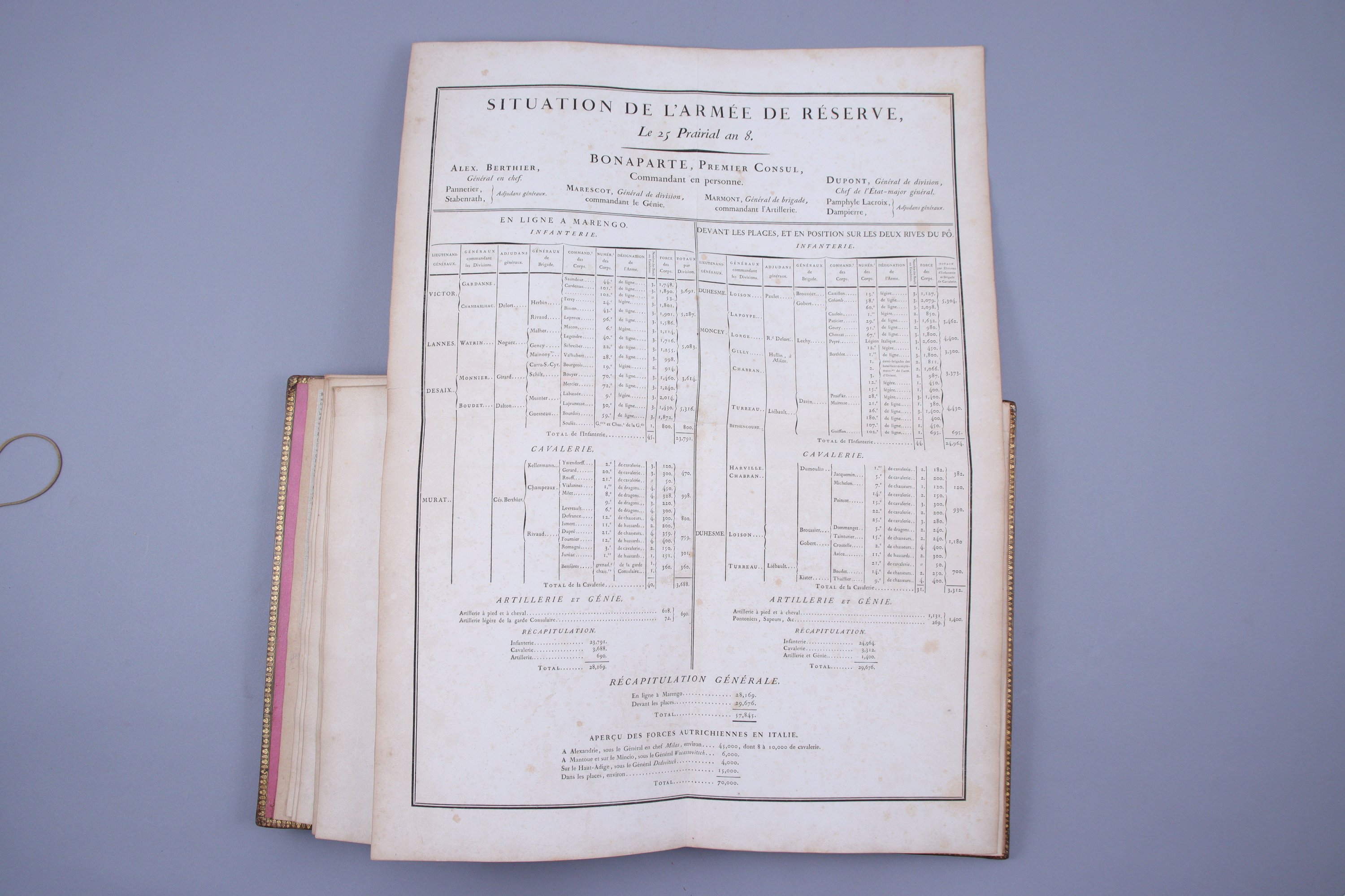 Grand in-4° (290 X 235 mm), (faux-titre, et titre-frontispice gravé par Niquet d'après Vernet), 40 pages. Un tableau dépliant "Situation de l'Armée de réserve" (500 X 400 mm), 5 cartes dépliantes rehaussées à l'aquarelle montées sur onglets, et 1 vue dépliante de la Bataille de Marengo, dessinée par Bagetti, capitaine ingénieur géomètre. Plein veau marbré fauve, large roulette d'encadrement de feuilles de laurier, armes de Napoléon sur les plats, filet sur les coupes, roulette intérieure. Toutes tranches dorées. (Très habiles restaurations, presque invisibles, aux coiffes et à un coin)