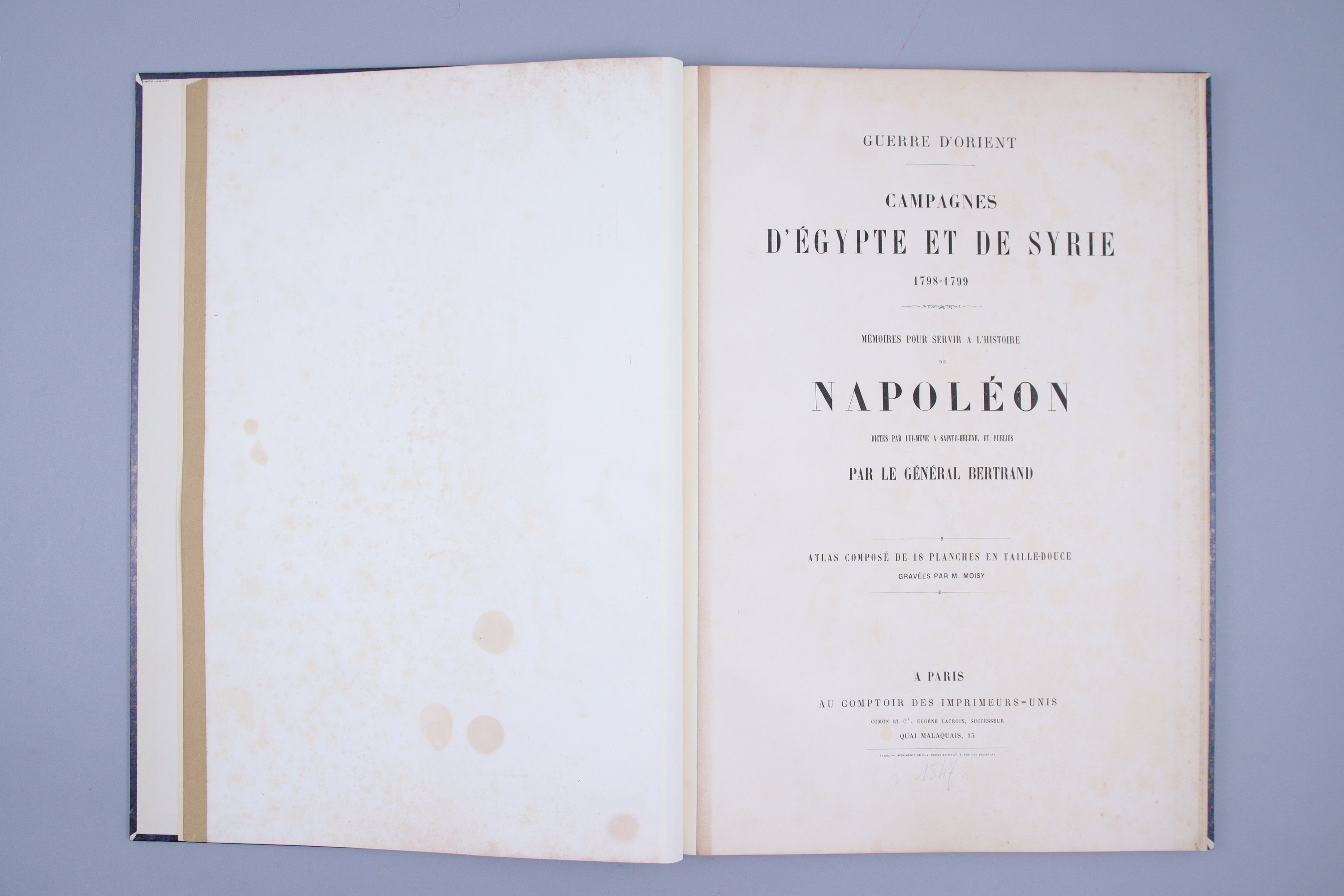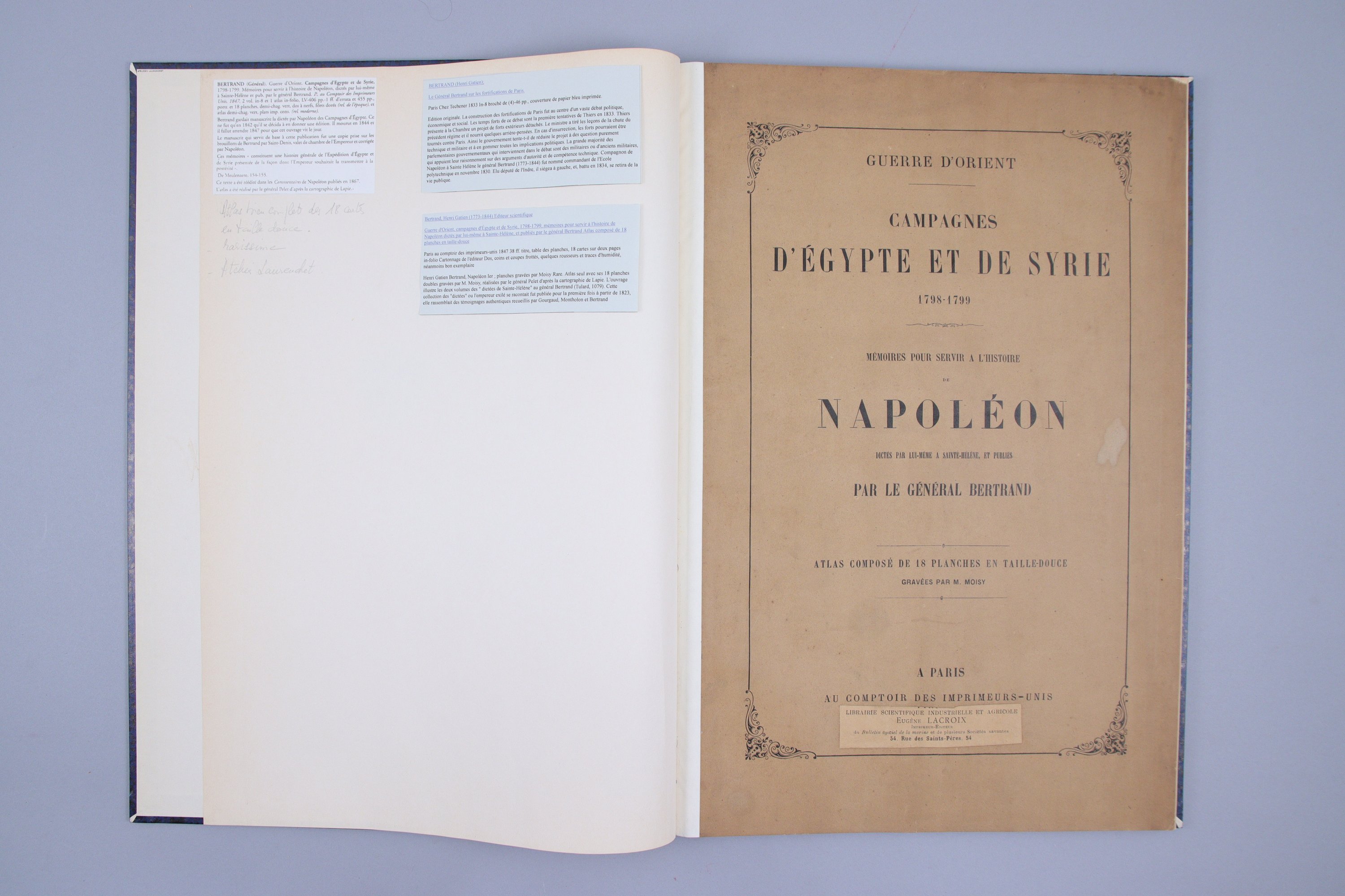 Guerres d'Orient. Campagnes d'Egypte et de Syrie. 1798-1799. Mémoires pour servir à l'histoire de Napoléon dictés par lui-même à Sainte-Hélène, et publiés par le Général Bertrand. Avec un atlas de 18 cartes.