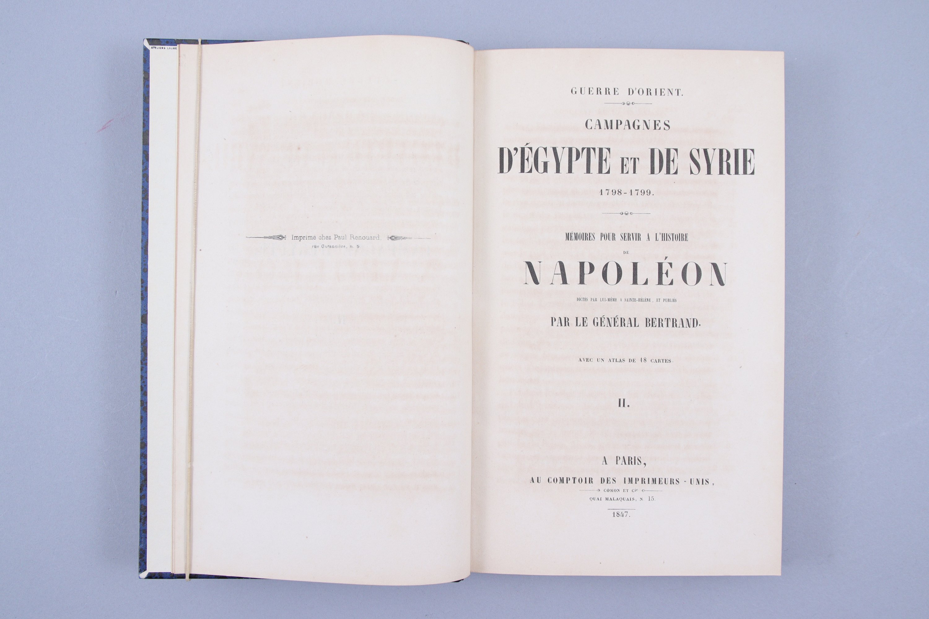 1/2 veau bleu nuit, sans nerf, portant en queue la date de 1847. Elégantes reliures pastiche,parfaitement établies, signées "Atelier Laurenchet". Très bel exemplaire de la seule édition de ce texte, imprimé par le grand typographe Paul Renouard. Le général, Bertrand, fidèle des fidèles, gardait le manuscrit des campagnes d'Egypte fait sous la dictée de Napoléon. Il ne décida qu'en 1842 de le proposer à l'édition. Il mourut en 1844, et ce n'est qu'en 1847 que l'ouvrage vit le jour.