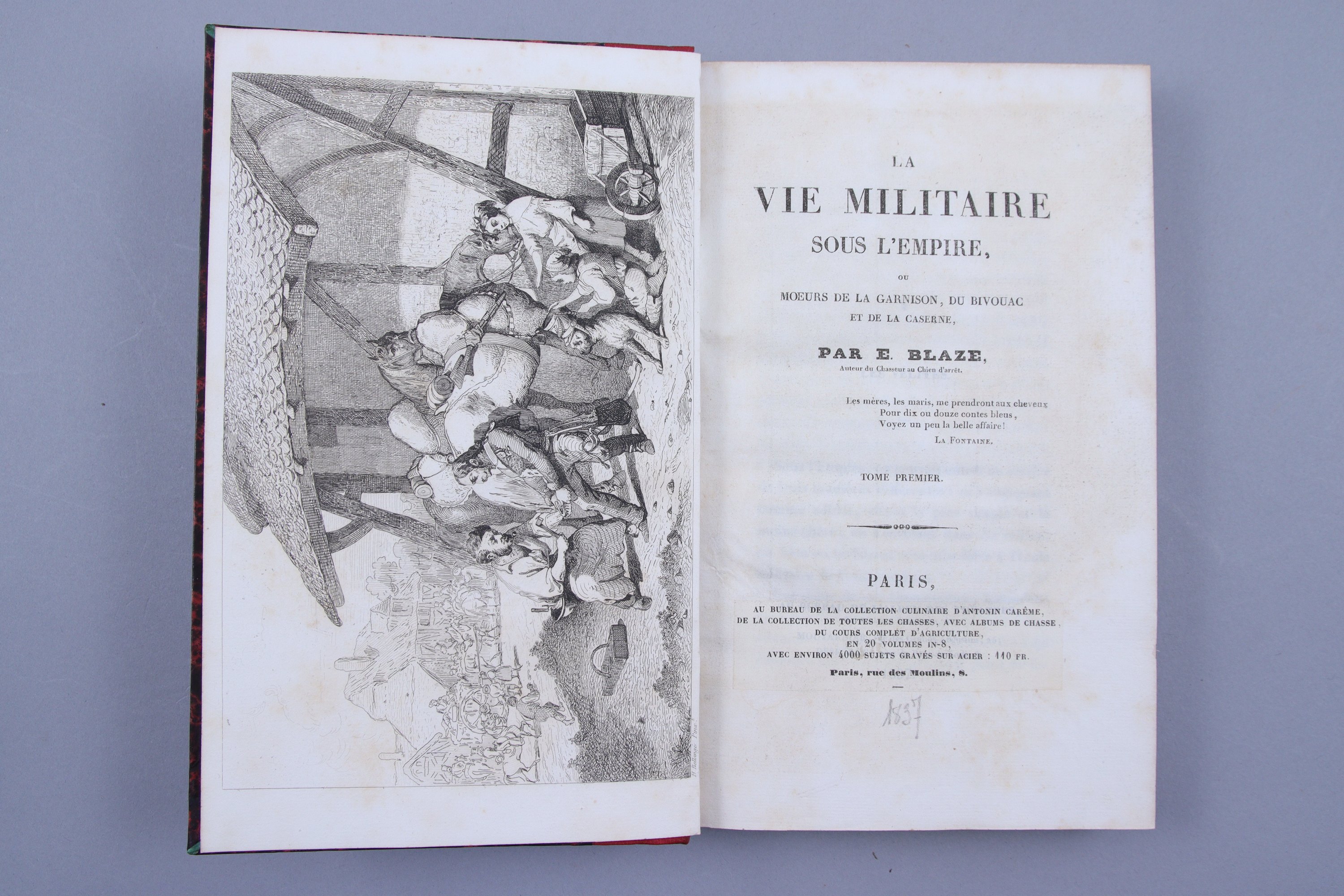 Bel exemplaire de la très rare édition originale, illustrée d'une belle gravure sur acier d'Hippolyte Bellangé en frontispice. Tulard (169) ne connait qu'une réédition vers 1865 -avec titre (forcément) changé en "La vie militaire sous le Premier Empire". Les vélites, le bivouac, les marches, les cantinières, les chirurgiens, les prisonniers de guerre, les exécutions...