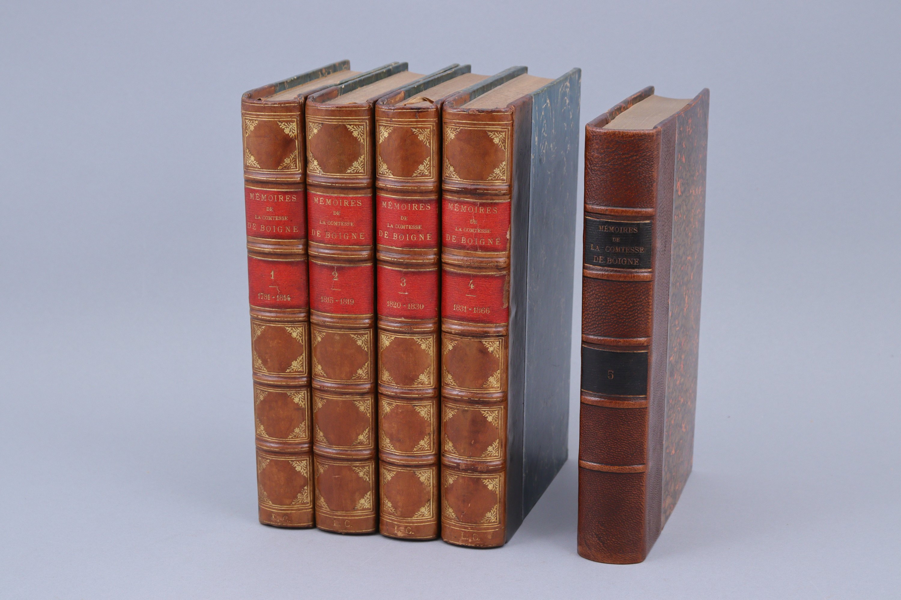 En tout 5 volumes in-8. 1/2 basane verte du temps pour les tomes I à IV ; 1/2 chagrin marron du temps pour le tome V. (Les dos des tomes I à IV sont insolés.)