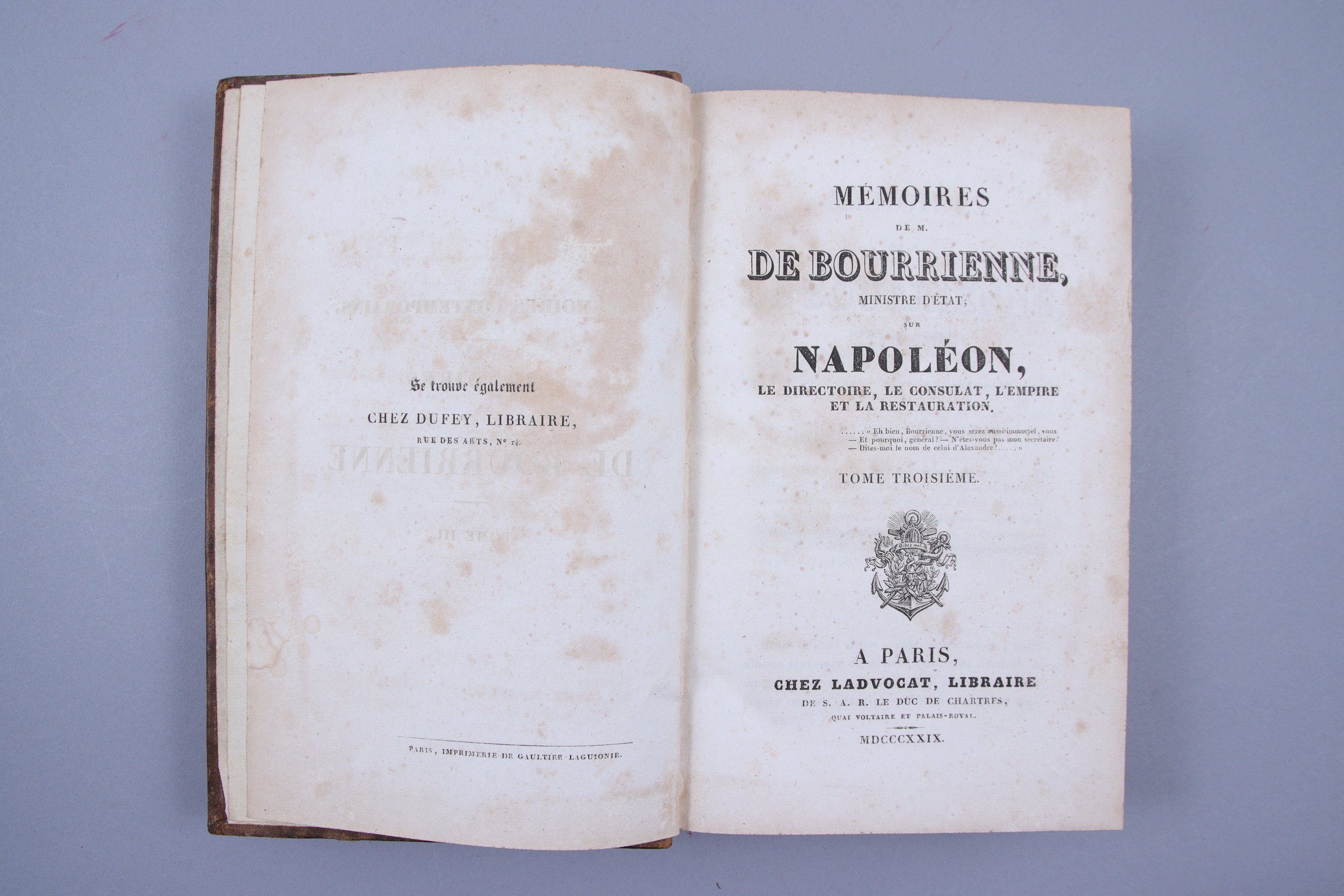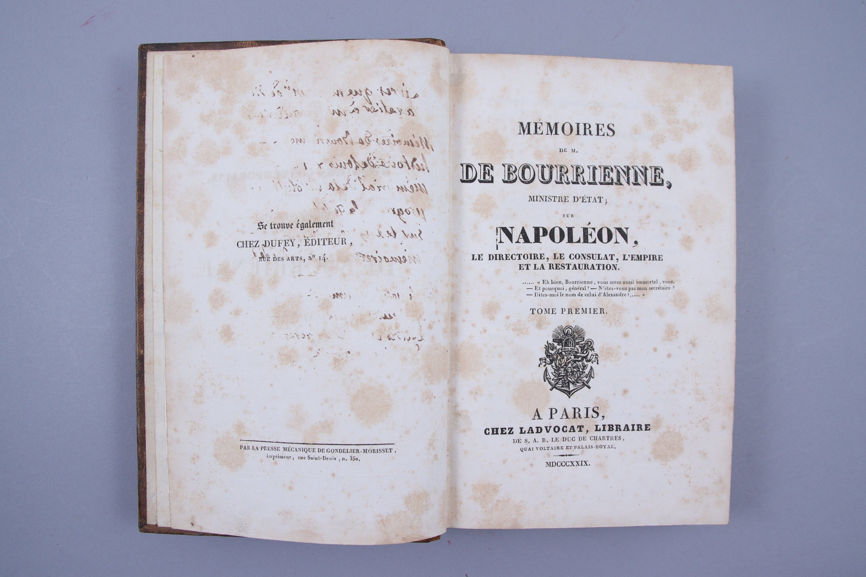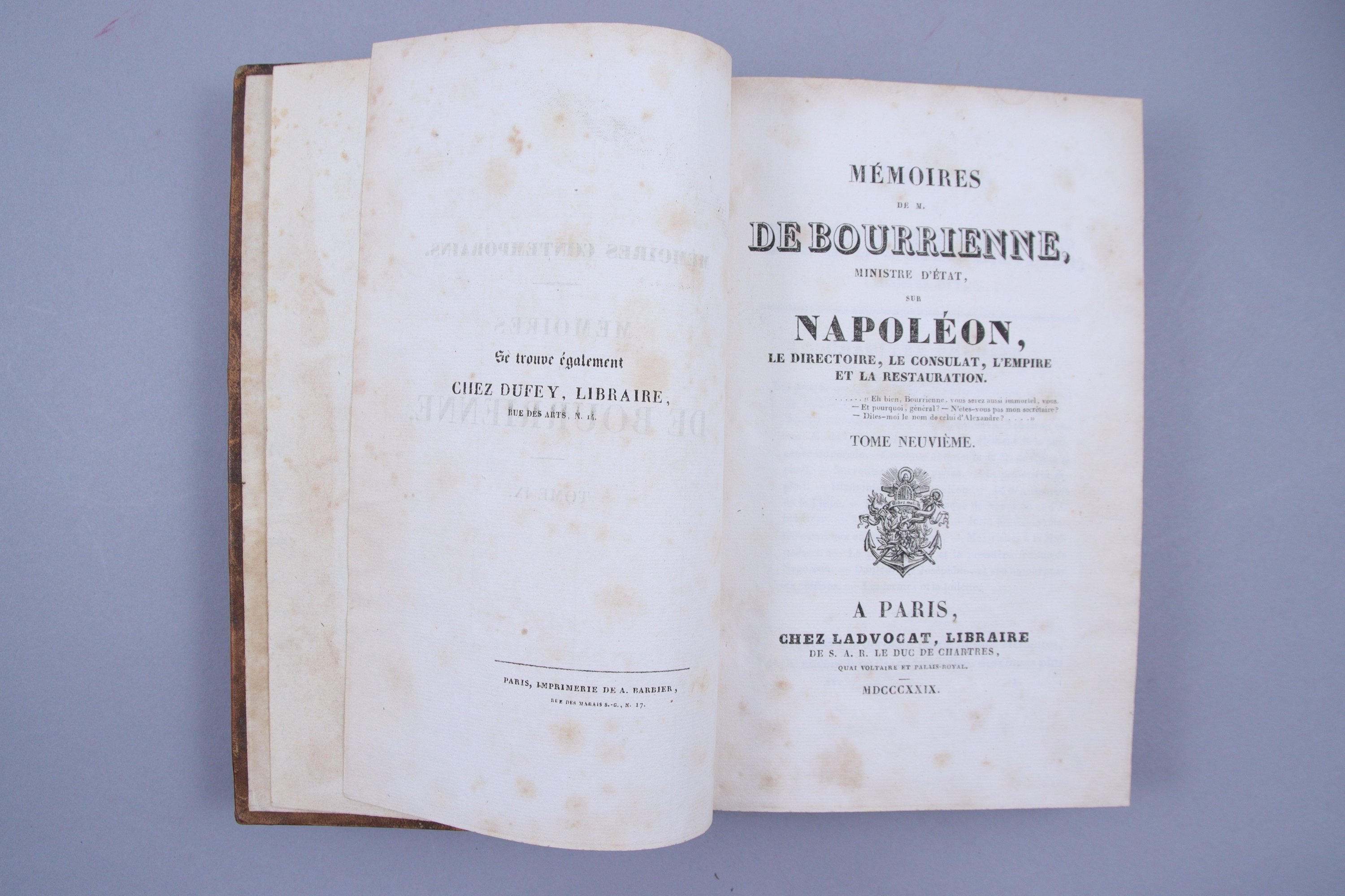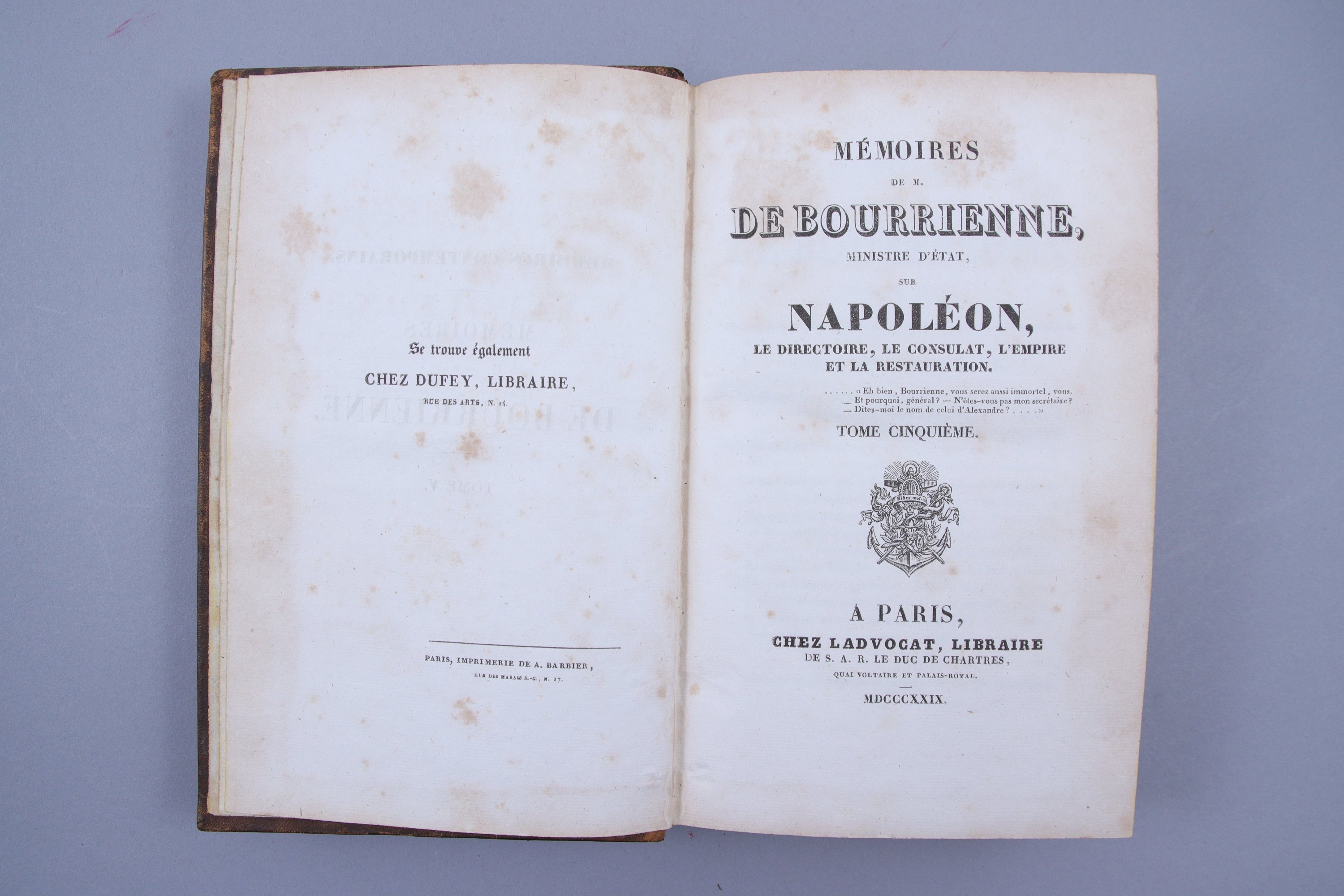 "Publiés en 1829, ces Mémoires firent sensation. Ils ont été depuis cette date constamment utilisés par les historiens de Napoléon" (Tulard, 211). Bourrienne, condisciple et seul ami intime de Bonaparte à l'Ecole de Brienne, devient son secrétaire dès la campagne d'Italie d'avril 1797, jusqu' à 1802. Il est le rédacteur du Traité de Campo Formio, et le directeur de l'Imprimerie de l'Armée d'Egypte. Compromis en 1802 dans la faillite frauduleuse de ses amis les frères Coulon, tanneurs et fournisseurs des cuirs pour l'armée d'Italie, il est envoyé par Napoléon à Hambourg, pour surveiller l'application stricte du blocus continental ... Il en profite, en 1807, pour commander à des fournisseurs britanniques les manteaux des troupes française satationnées en Prusse... .Rappelé à Paris par l'Empereur en 1813, il se rallie aux Bourbons en 1814. Il est ruiné en 1830, à la chute de Charles X, et donne de nombreuses notes et cahiers à Villemarest, pour la rédaction de ses Mémoires. Il meurt en 1834 dans un asile d'aliénés.