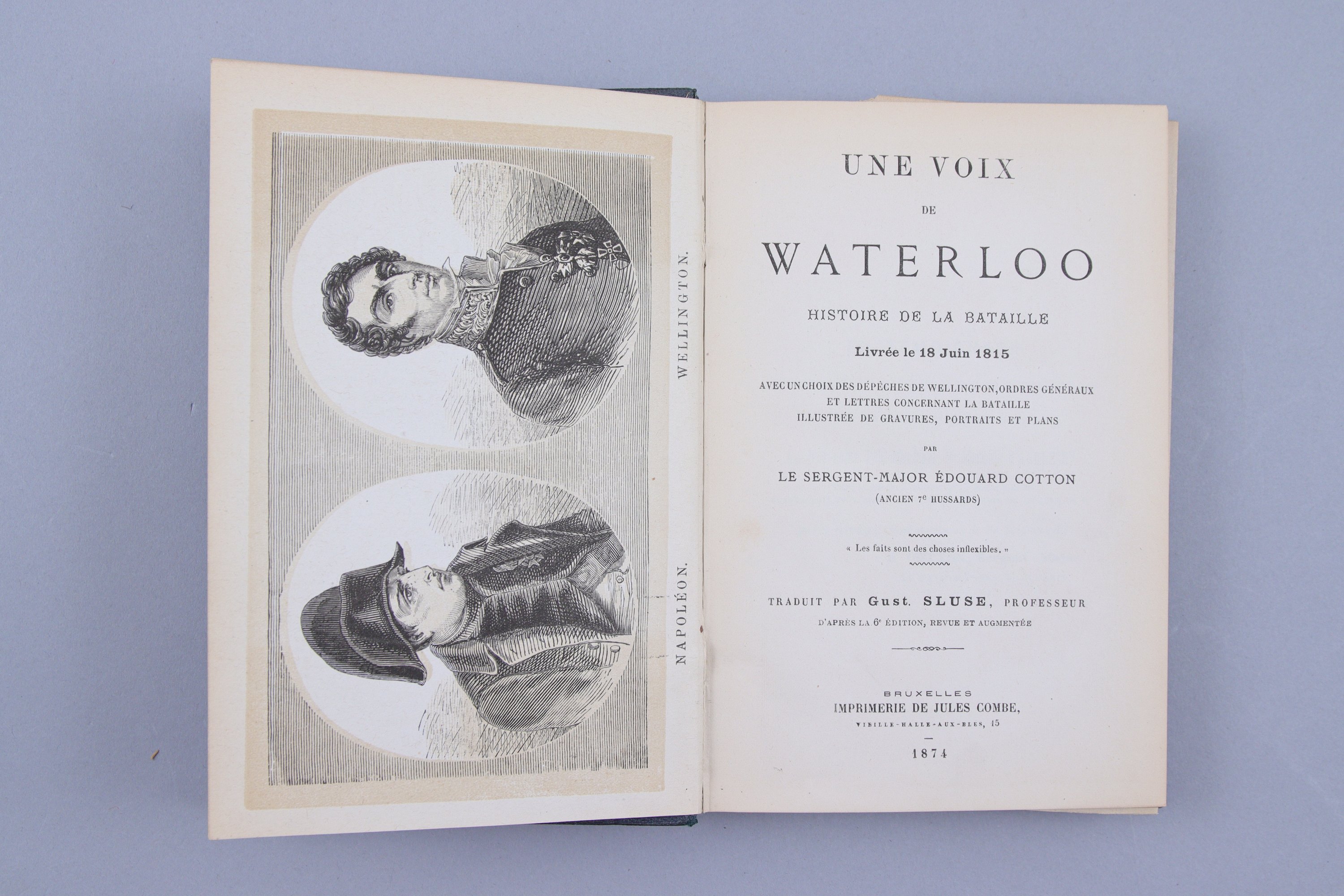 Une voix de Waterloo. Histoire de la bataille livrée le 15 juin 1815. Avec un choix des dépêches de Wellington, ordres généraux et lettres concernant la bataille. Illustrée de gravures, portraits et plans. Par le sergent-major E. Cotton (ancien 7ème hussards). Traduit par G. Sluse d'après la 6ème édition.