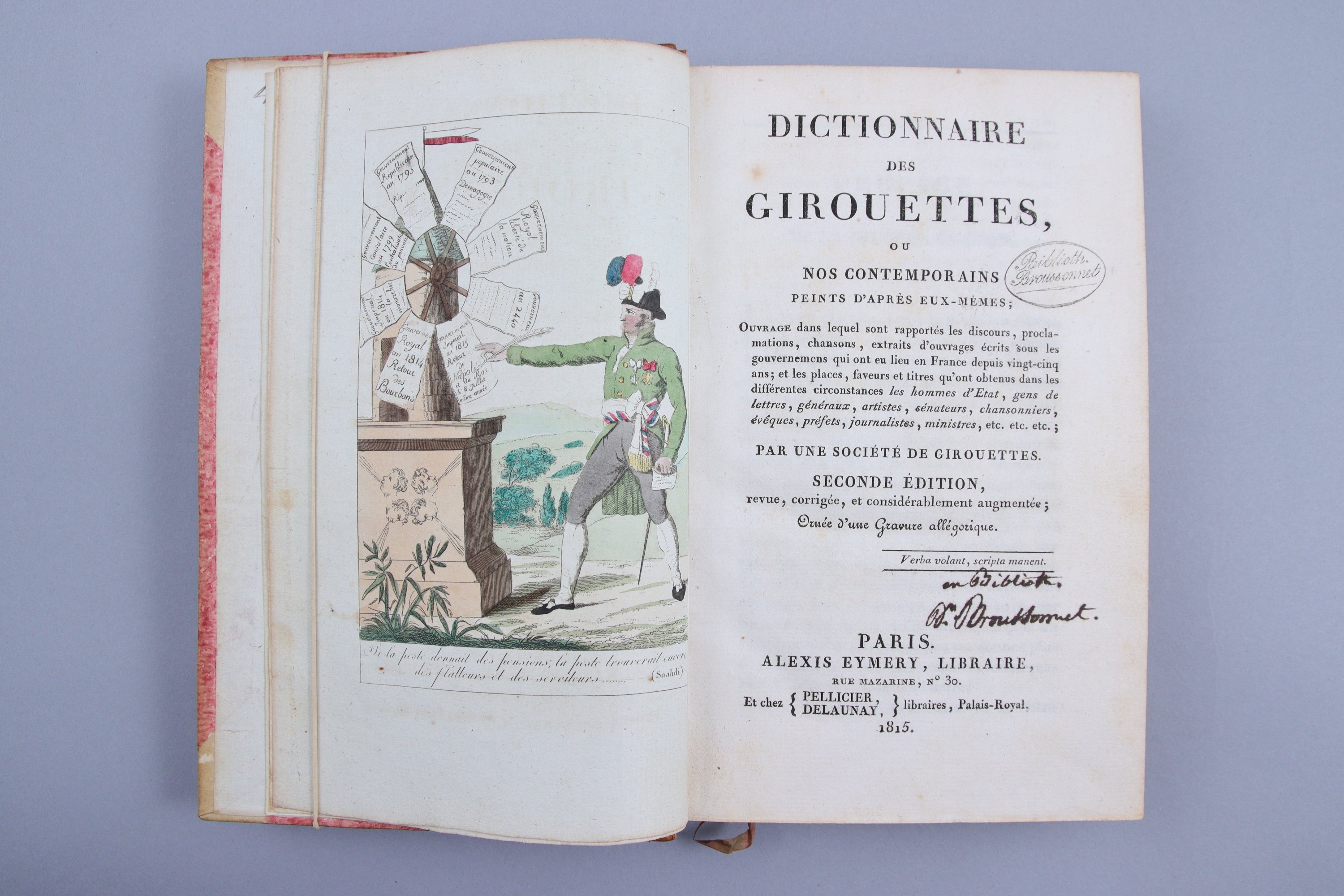 Bel exemplaire de la seconde édition, la plus complète, du Dictionnaire des Girouettes dans lequel on s'efforce de recenser les retournements de veste, les trahisons, les changements de camp ou d'opinion des "hommes d'état, gens de lettres, généraux, artistes, sénateurs, chansonniers, évêques, préfets, journalistes, ministres etc"... de 1789 à 1815
