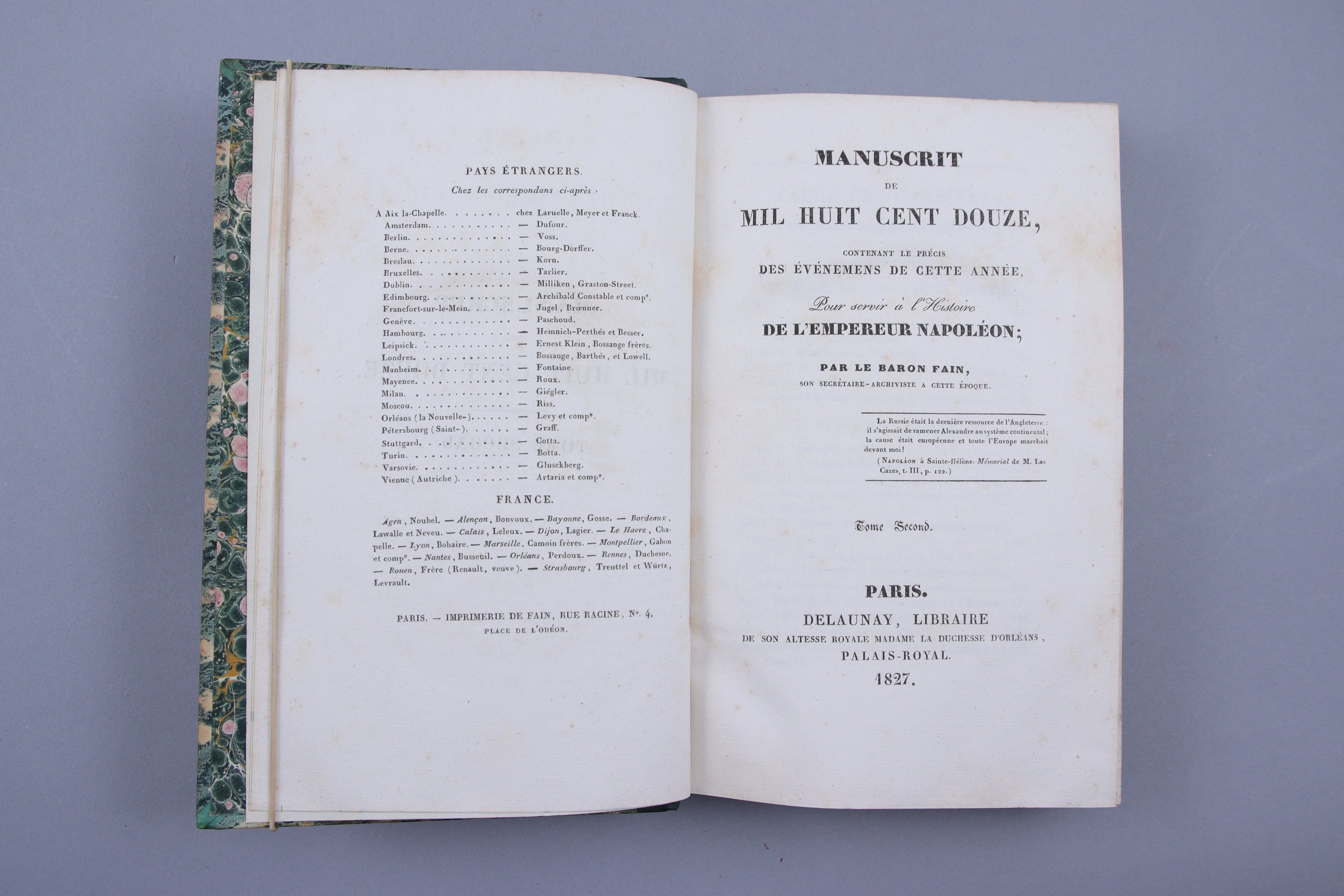 -Manuscrit de Mil Huit Cent Douze, contenant le précis des événemens de cette année, pour servir à l'Histoire de l'Empereur Napoléon. Par le Baron Fain.