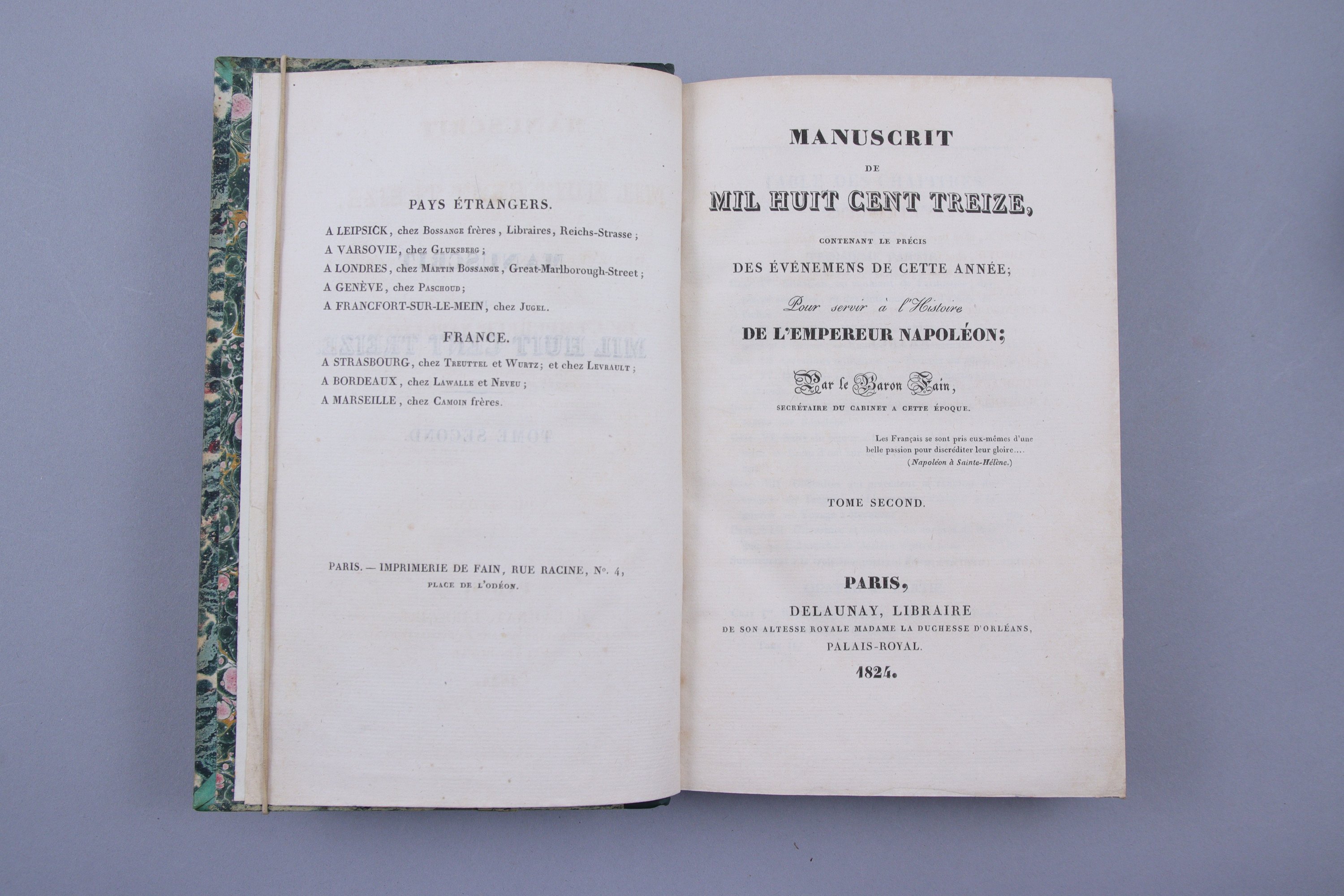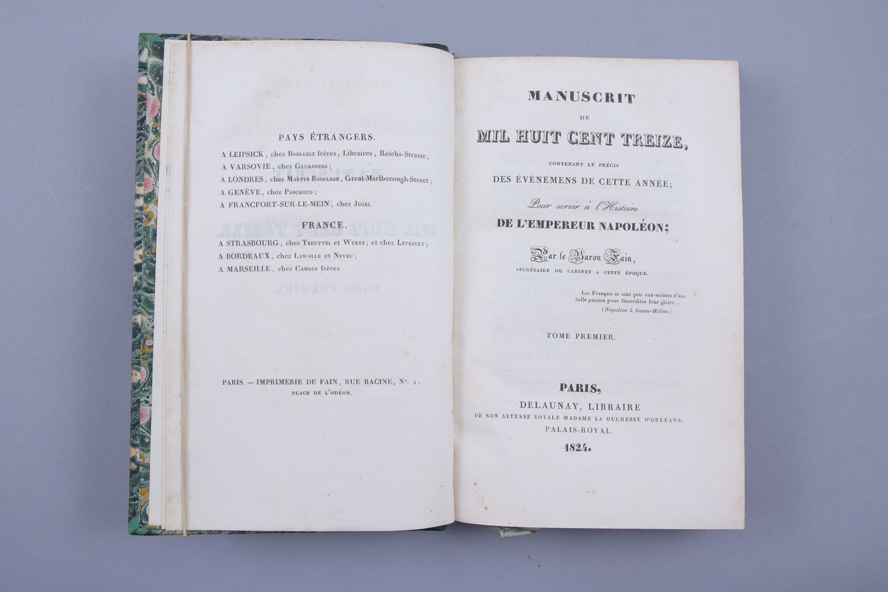 -Manuscrit de Mil Huit Cent Treize, comprenant le précis des événemens de cette année, pour servir à l'Histoire de l'Empereur Napoléon. Par le Baron Fain.