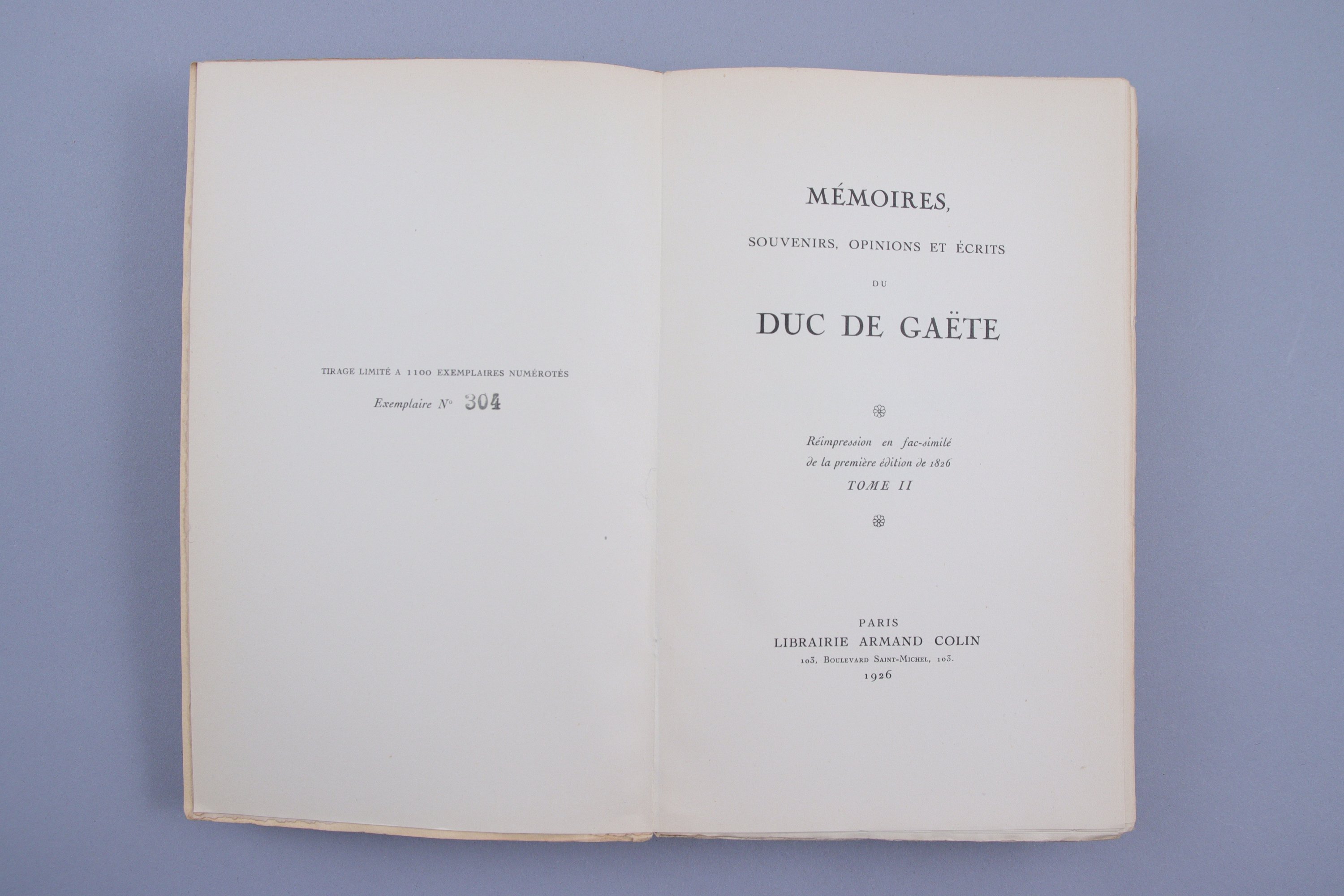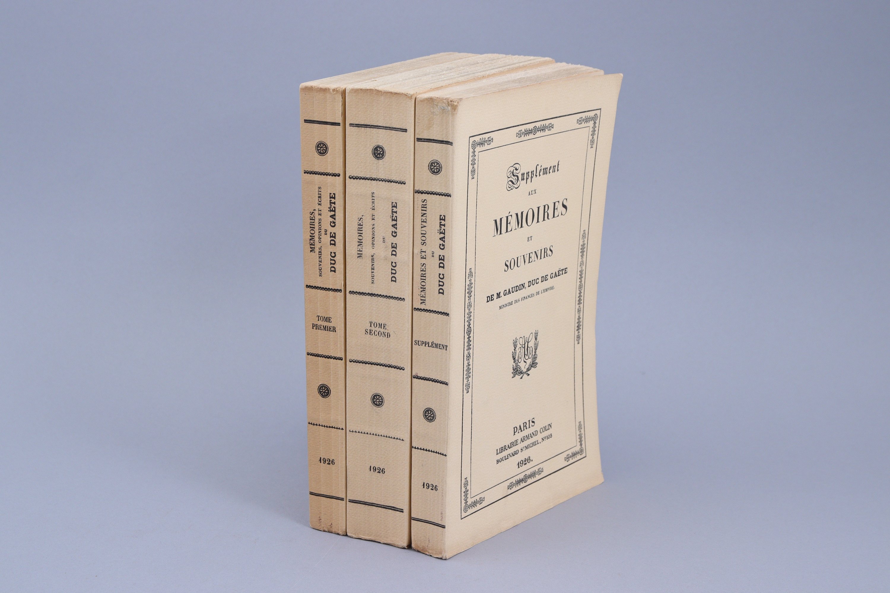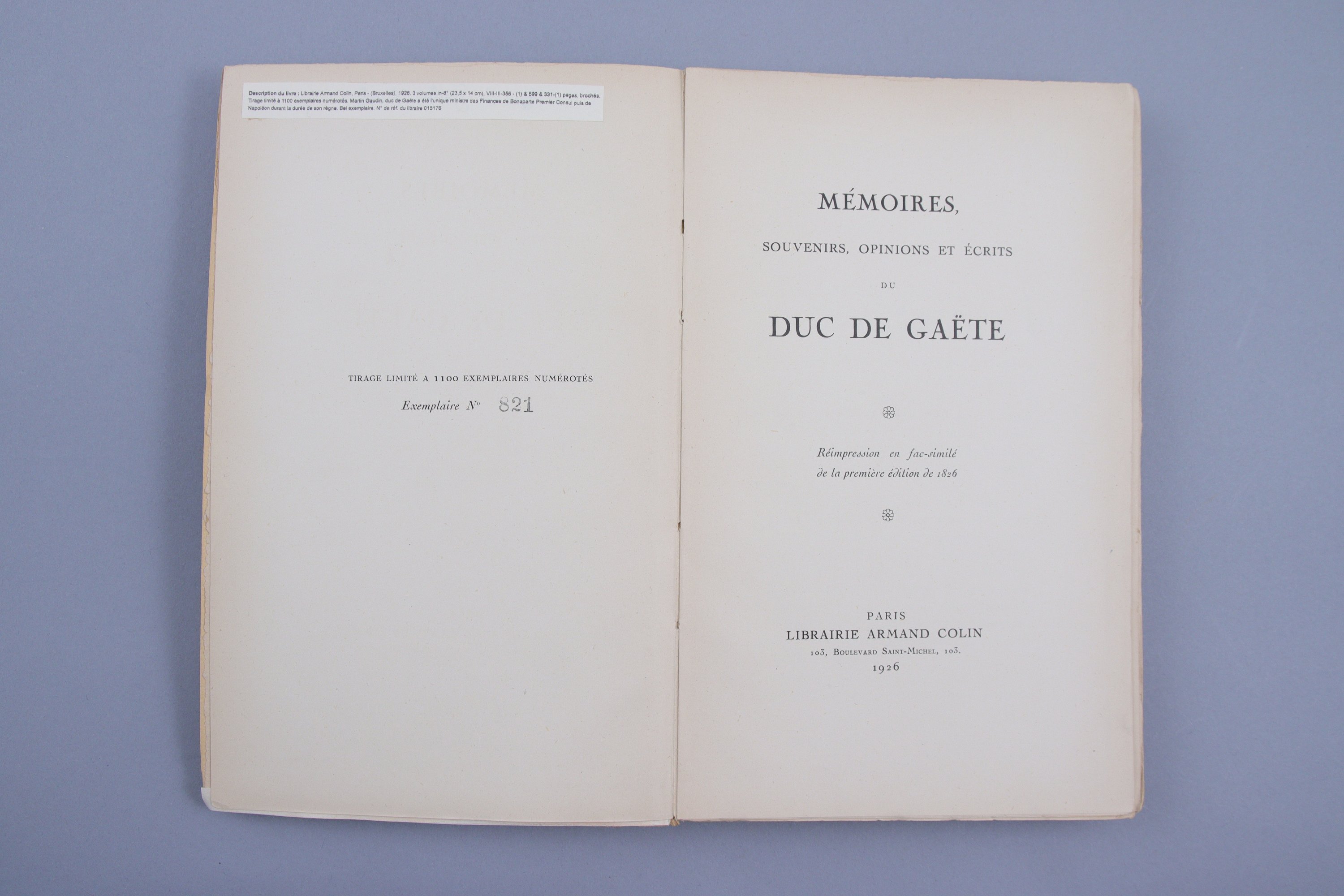 "Réimpression des trois volumes en fac-simile en 1926... Très techniques, ces mémoires visent naturellement à justifier l'action de Gaudin qui avait été l'objet d'attaques sous la Restauration. Ils n'en sont pas moins d'une grande importance pour l'histoire des finances impériales". (Tulard, 600).