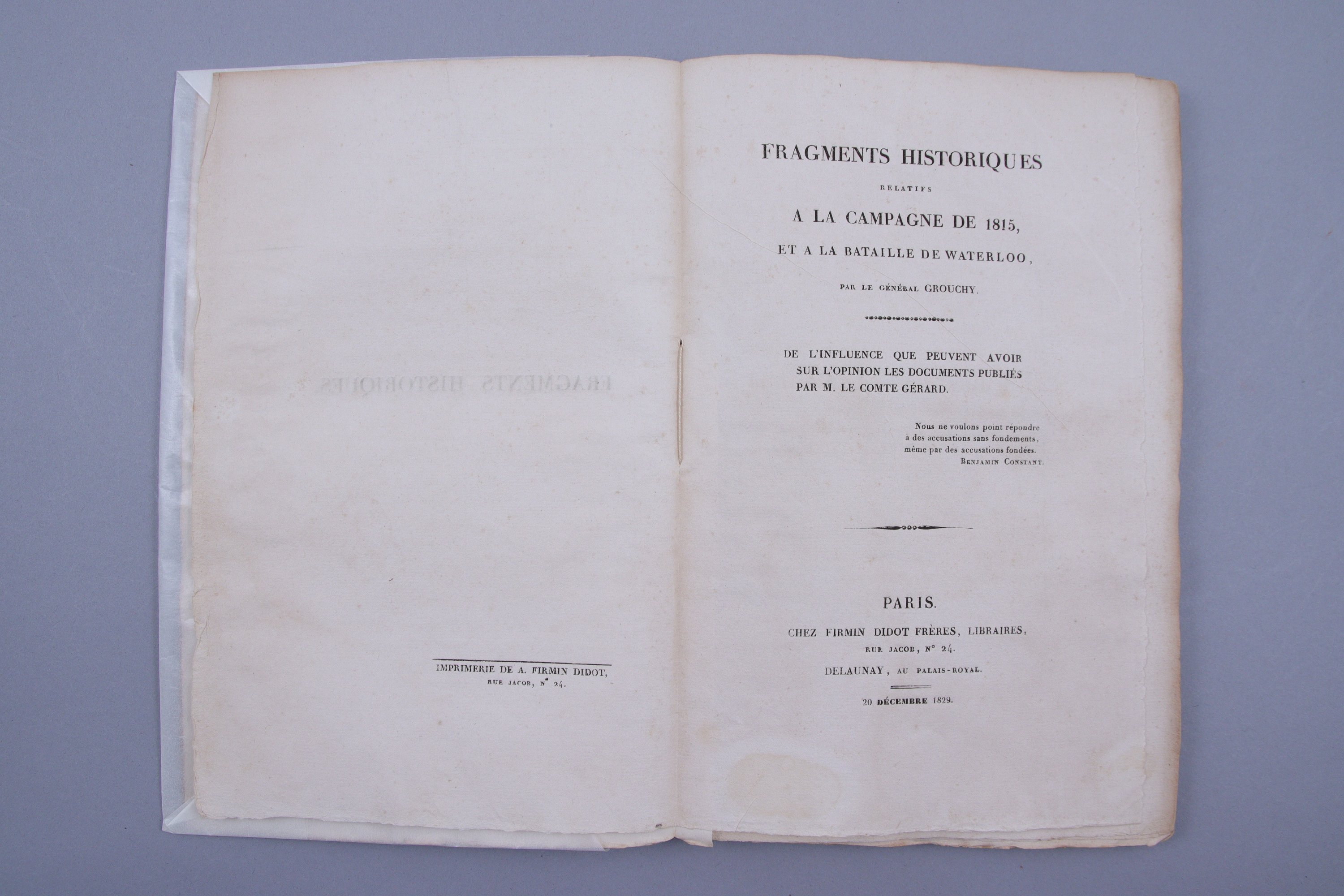Fragments historiques relatifs à la campagne de 1815 et à la bataille de Waterloo. Par le général Grouchy. De l'influence que peuvent avoir sur l'opinion les documents publiés par M. le Comte Gérard.