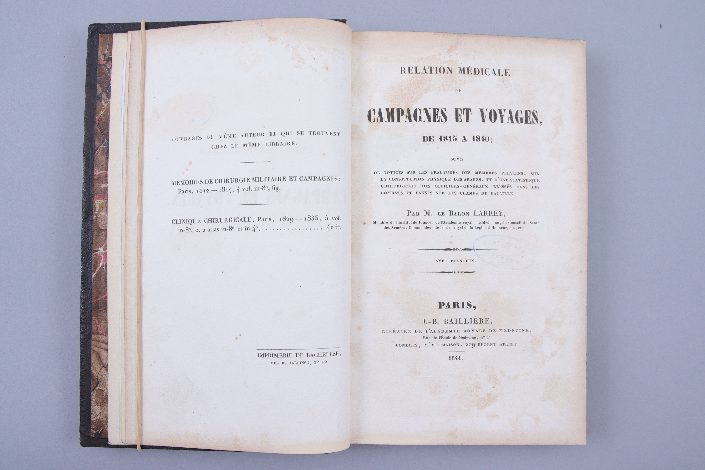 (Et :) Relation médicale de campagnes et voyages de 1815 à 1840, suivie de notices sur les fractures des membres pelviens, sur la constitution physique des Arabes, et d'une statistique chirurgicale des officiers généraux blessés dans les combats et pansés sur les champs de bataille. Par M. le Baron Larrey.