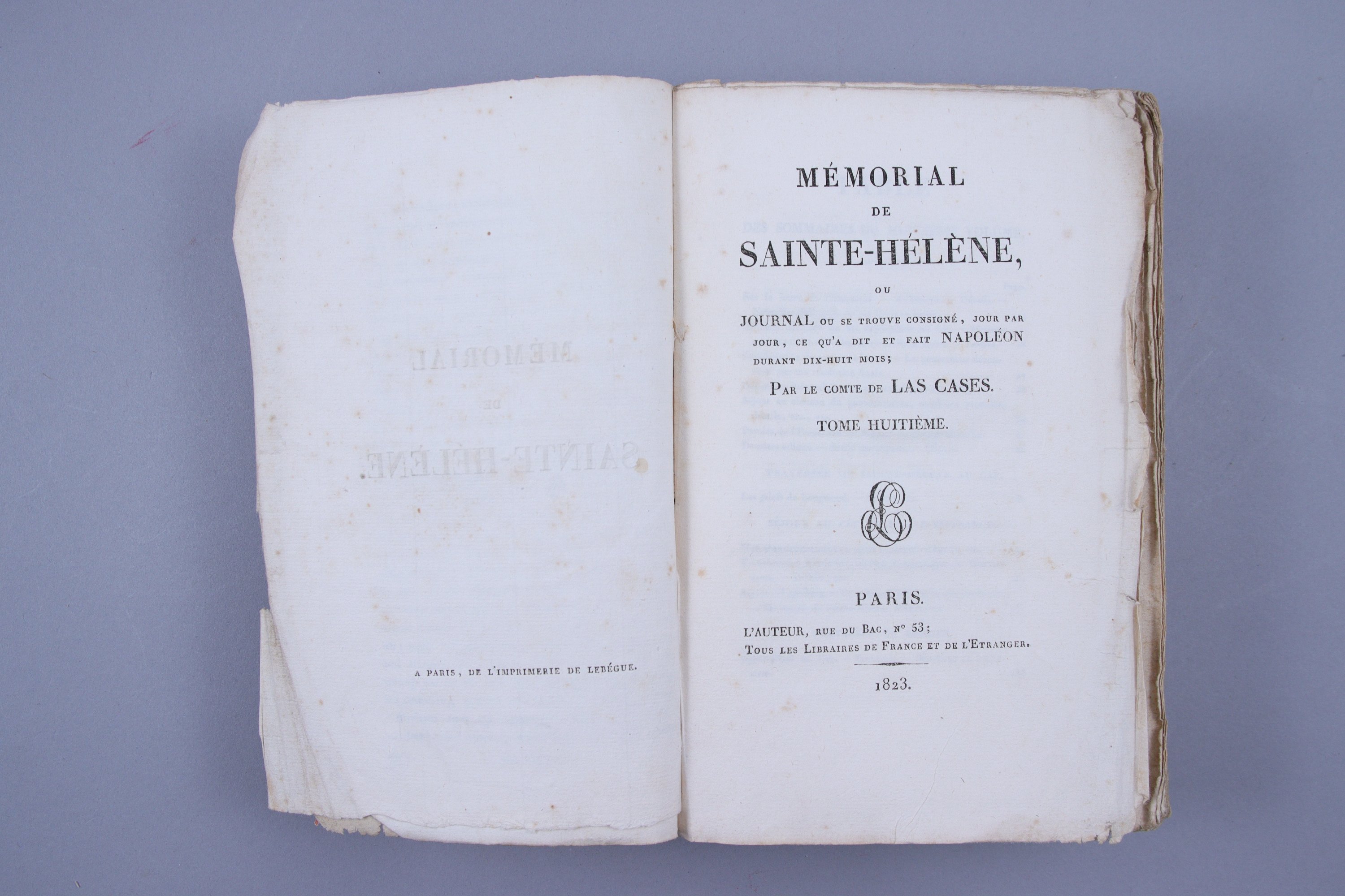 8 volumes in-8 pour le Mémorial, brochés, non rognés. Couvertures rouge-brique de parution ; étiquettes imprimées au dos. Grand plan dépliant de Sainte Hélène. (Etiquette du tome I en partie effacée ; quelques menus défauts au dos du tome I, et sur le plat supérieur du tome V).