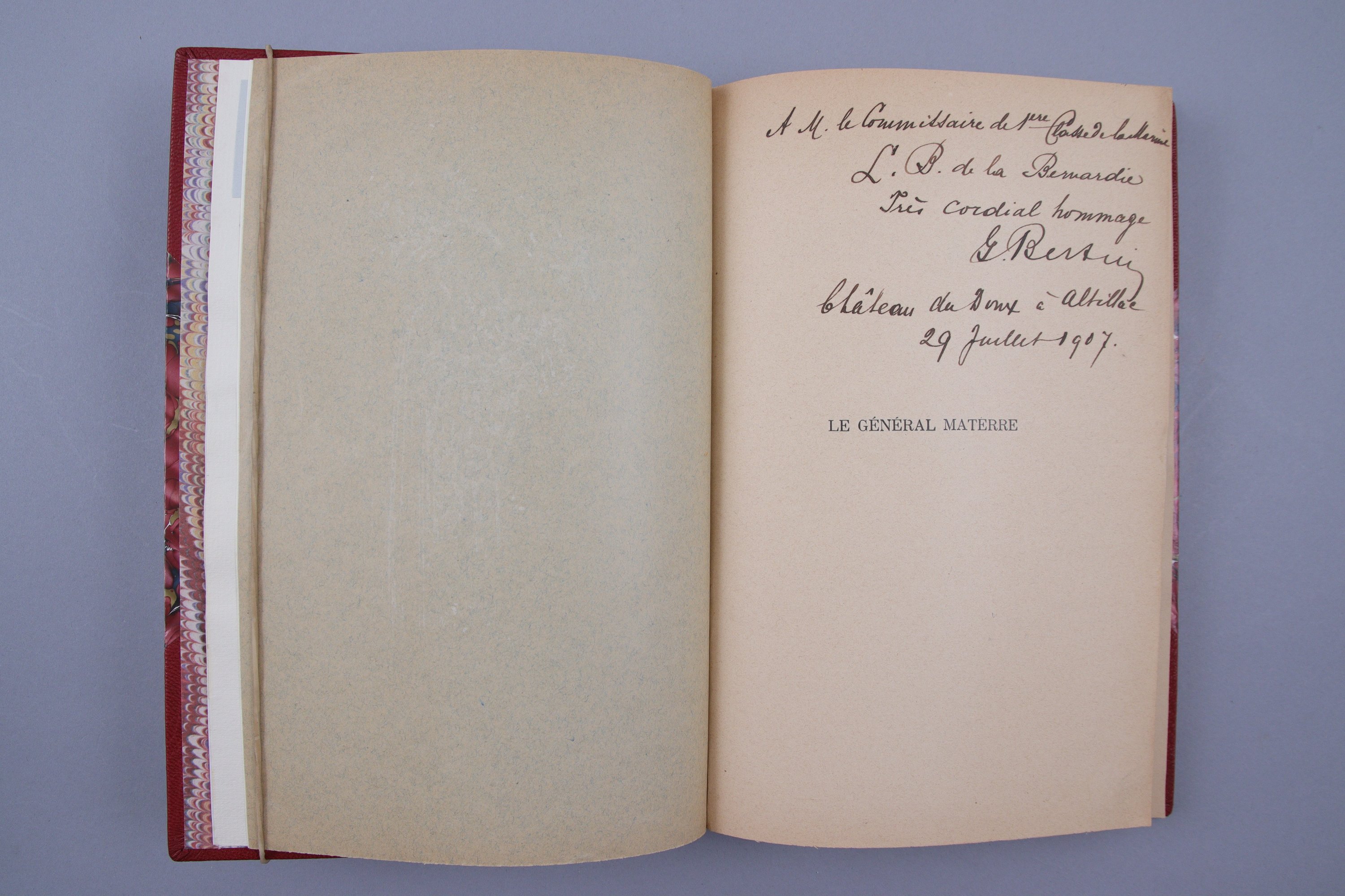 Envoi de Georges Bertin (1849-1910) "A M. le commissaire de 1ère classe de la Marine L.B. de la Bernardie" daté d'Altillac, 1907