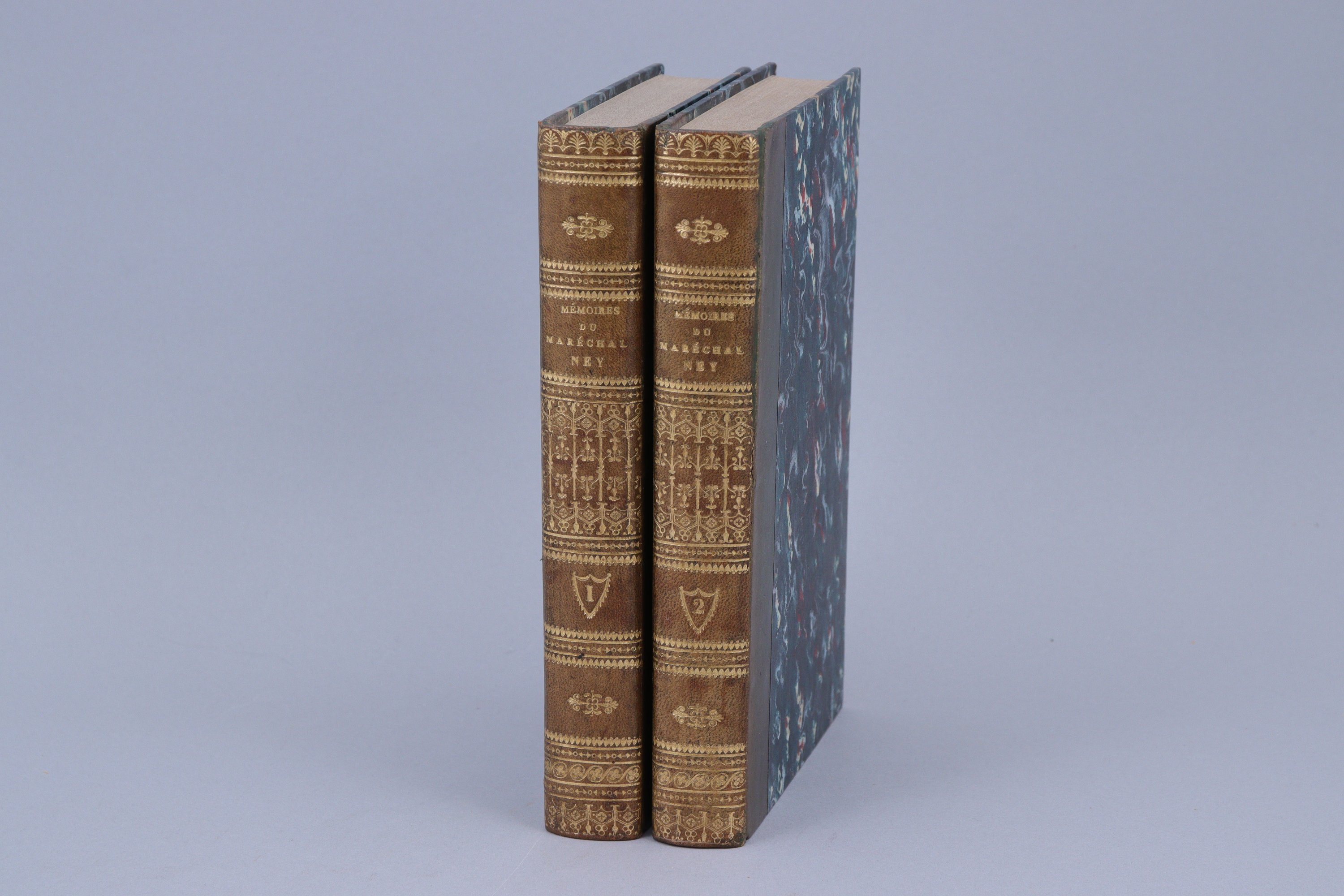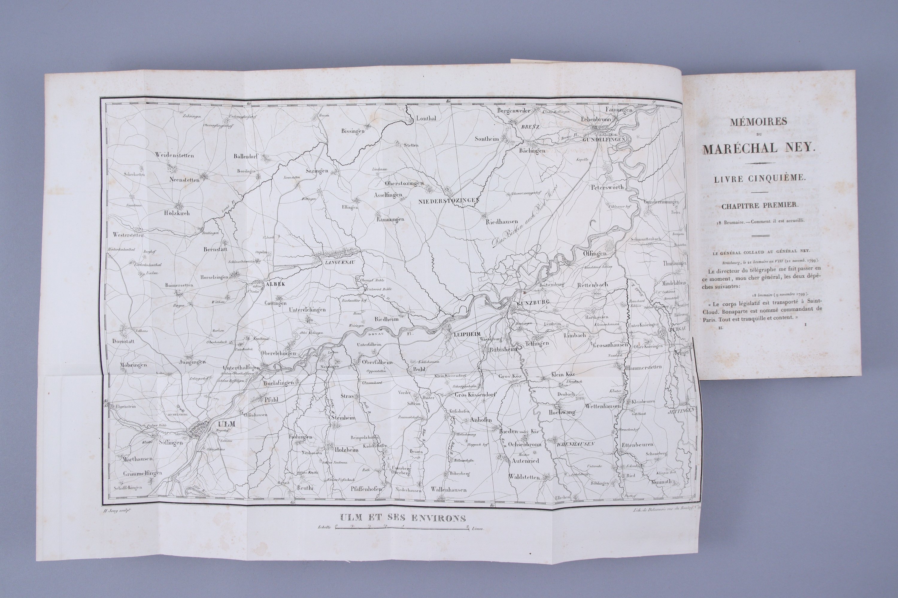 Bon exemplaire de la rare édition originale des Mémoires de Ney, qui semble avoir été tirée à petit nombre et non diffusée dans le commerce. Agréable exemplaire, complet de ses 2 grandes cartes et d'un croquis dépliant, ayant conservé ses couvertures jaunes de parution, dont l'une, annonçant que "la deuxième livraison est sous presse", est ornée de l'aigle impériale.