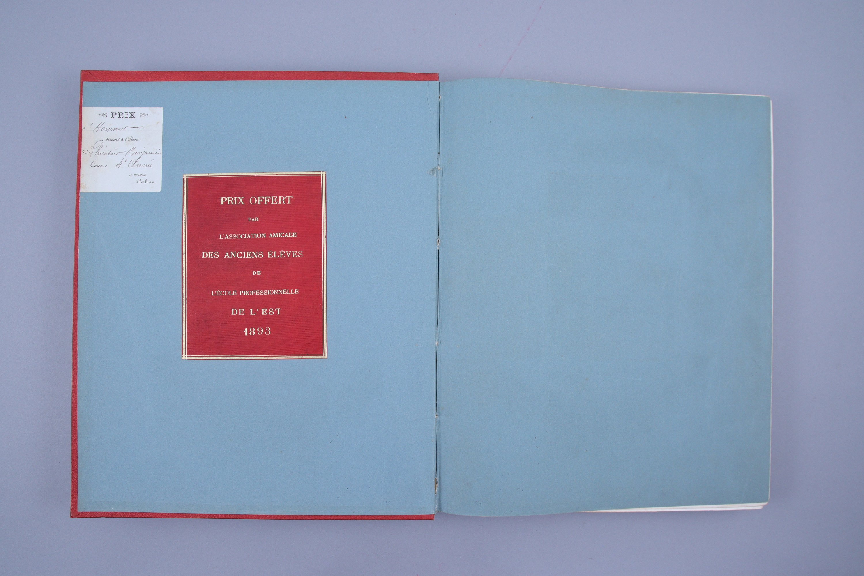 Grande étiquette de veau maroquiné rouge : ex-praemio del'Association amicale des anciens élèves de l'Ecole Professionnelle de l'Est, datée 1893. Prix d'honneur décerné à M. Benjamin Lhéritier.