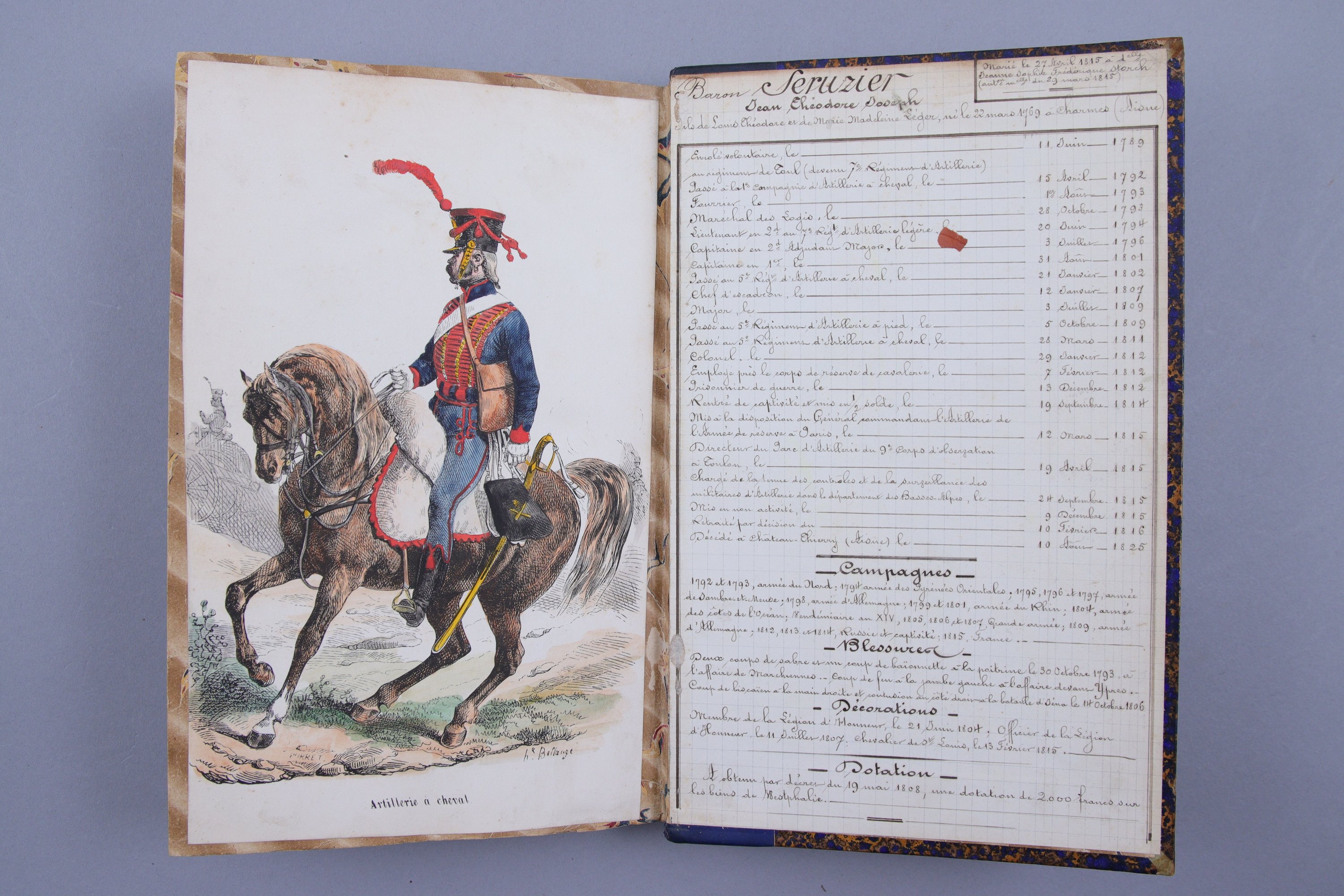 Collés en fin d'ouvrage, une gravure rehaussée à la gouache, vers 1850, représentant un artilleur à cheval, par Hippolyte Bellangé ; et un état des services manuscrit très complet de Seruzier, vers 1850, indiquant tous les détails de sa carrière militaire, fonctions et campagnes, blessures, décorations etc...