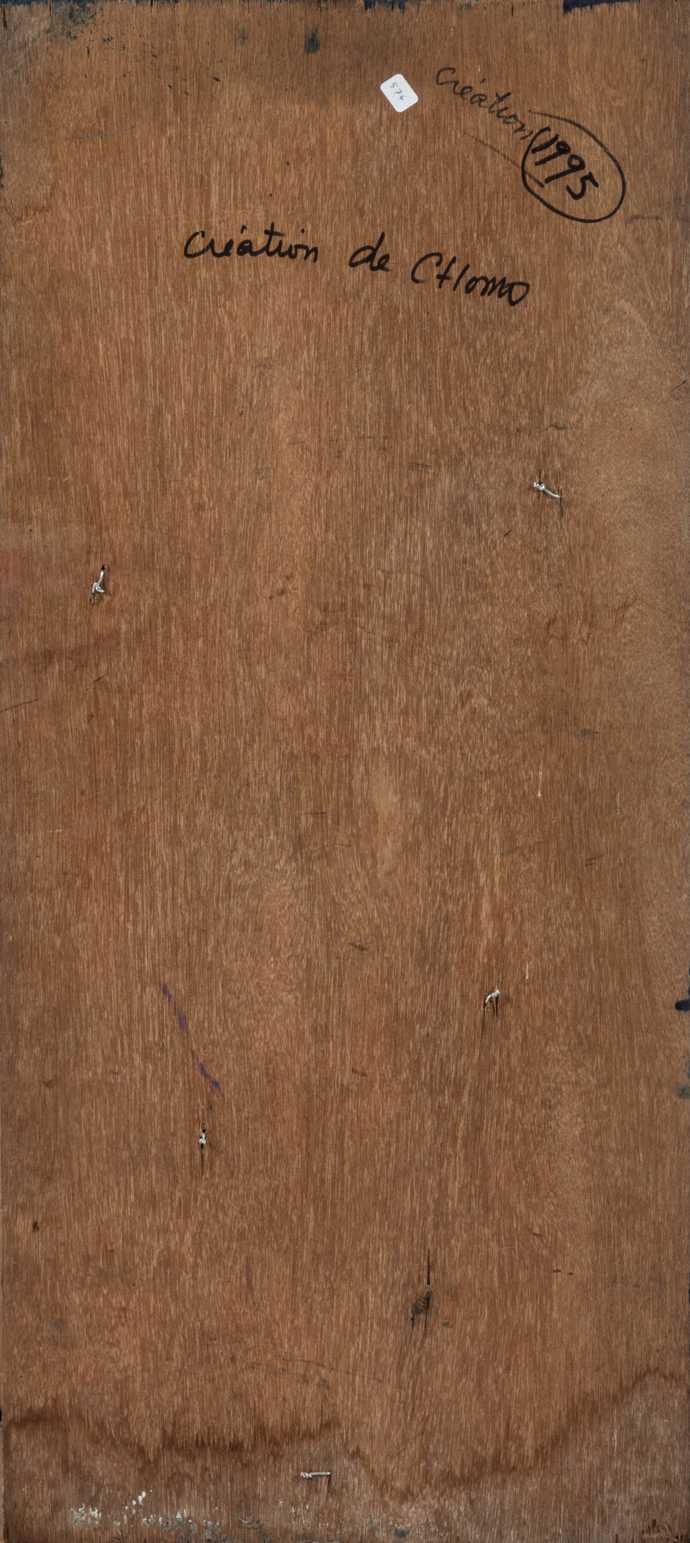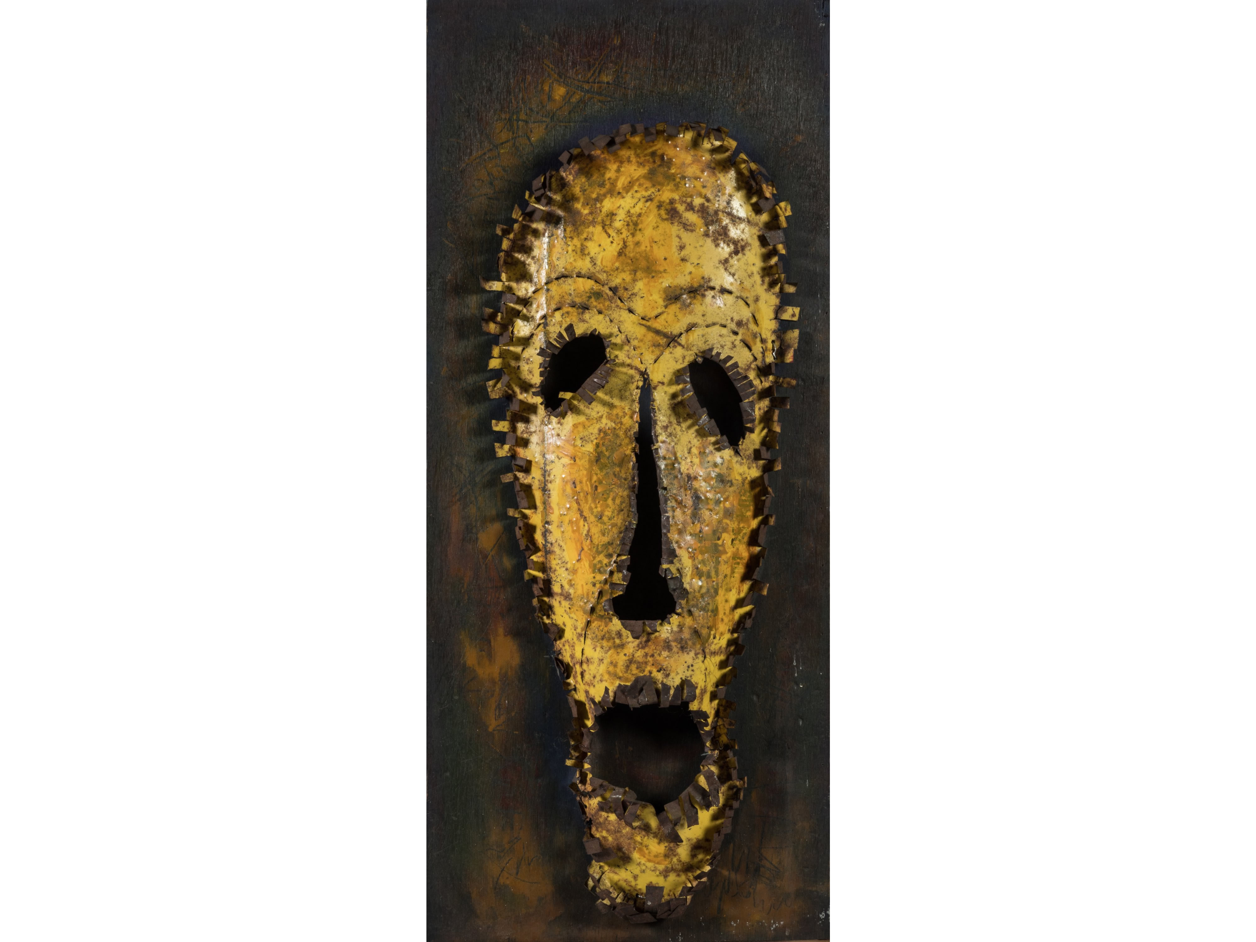 Bas-relief en tôle sur contreplaqué peint.