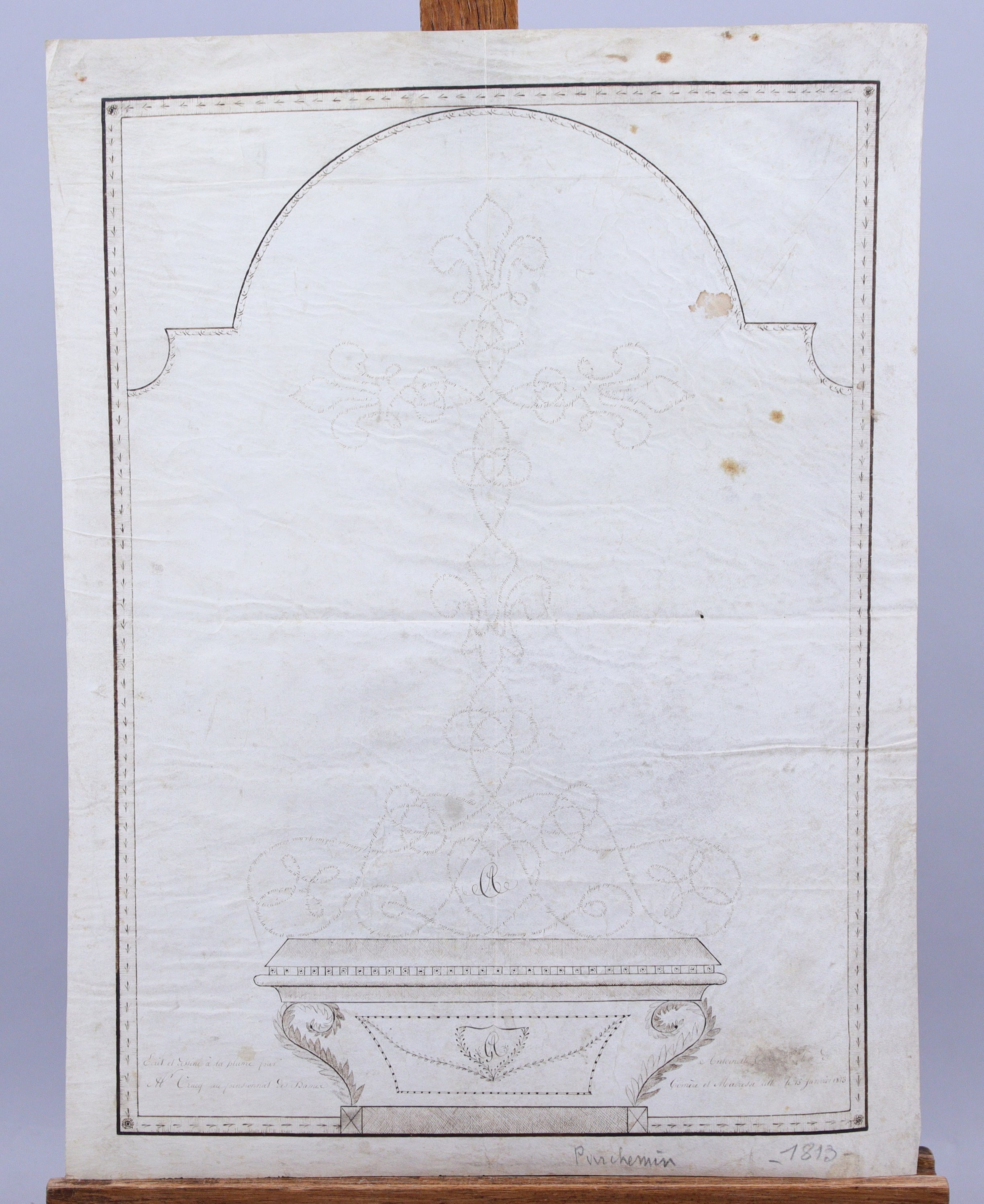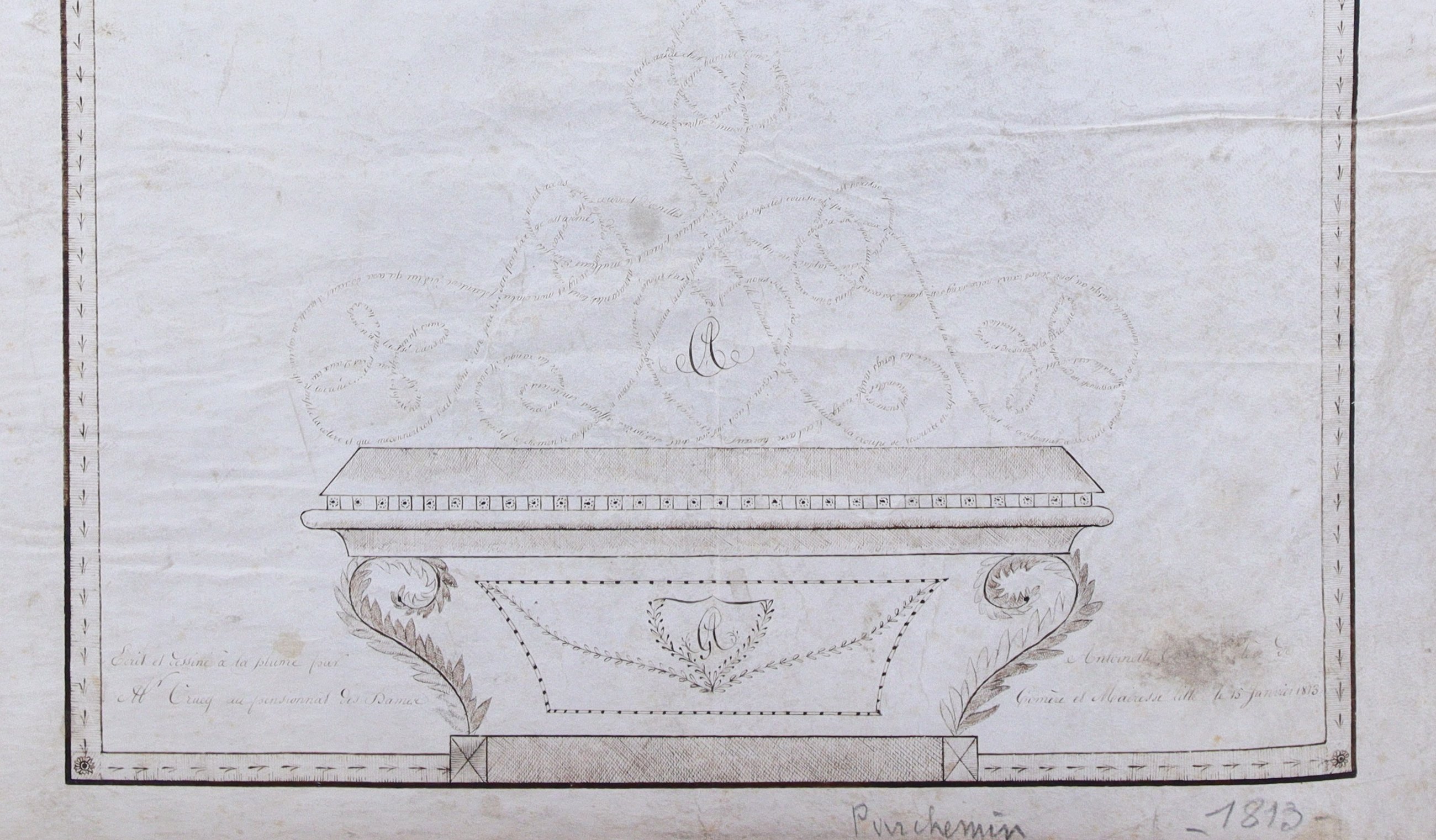 Encre sur papier annotée : "Ecrit et dessiné à la plume par Antoinette... ? A cinq au pensionnat des Dames Gomère et Mairesse, Lille, le 15 janvier 1813".