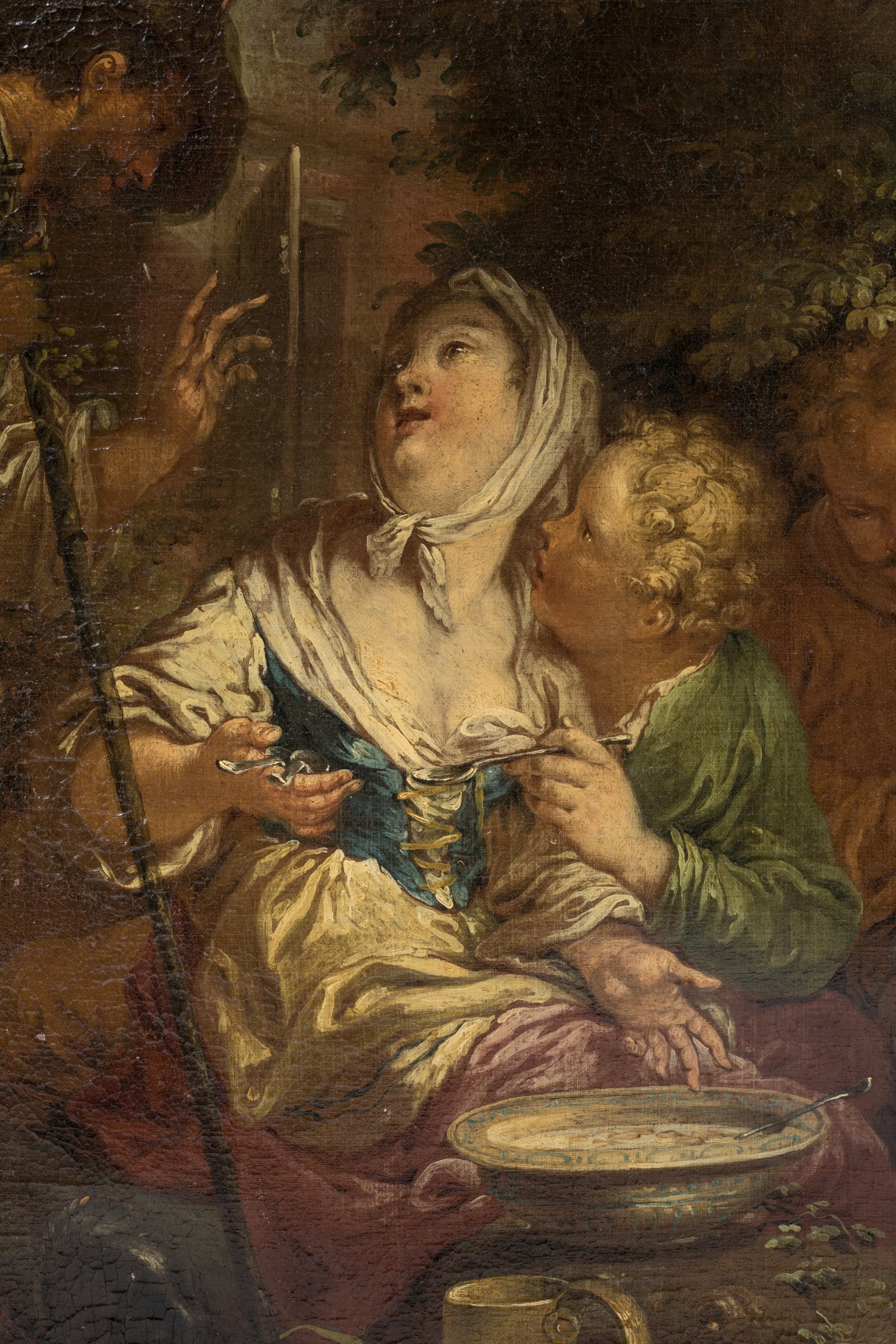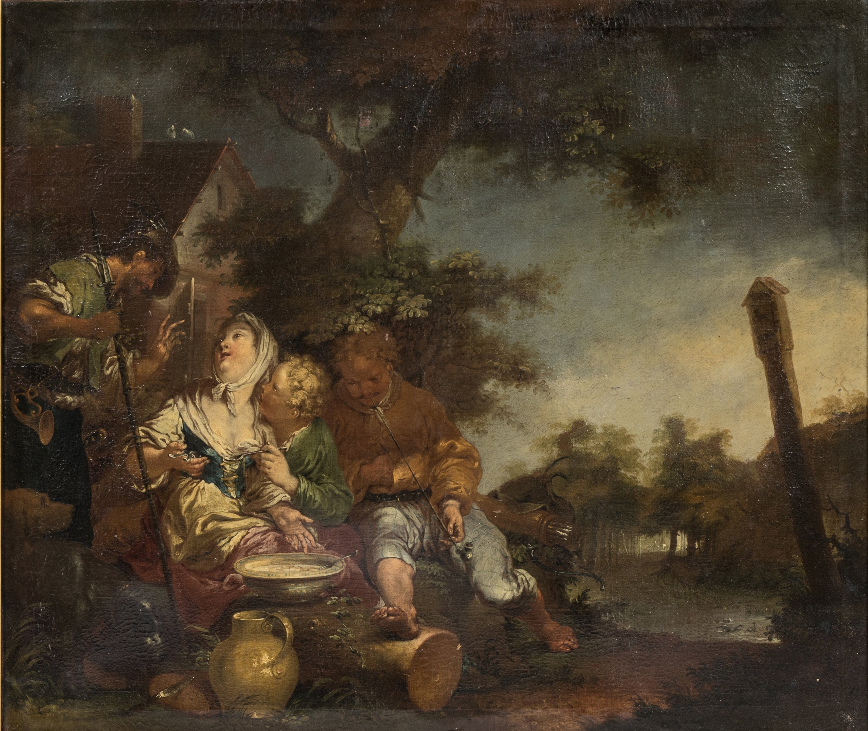Notre composition peut être rapprochée d'un tableau conservé dans une collection privée à Munich (monographie par Josef StraBber, 1994, fig. 207) daté des années 1770-1790. On trouve de nombreuses similitudes quant à la disposition des personnages, leurs regards, ou encore l'exécution des matières. Peintre d'histoire, auteur de nombreux décors rococo d'églises bavaroises, Januarius Zick a peint aussi plusieurs scènes de genre et pastorales.
