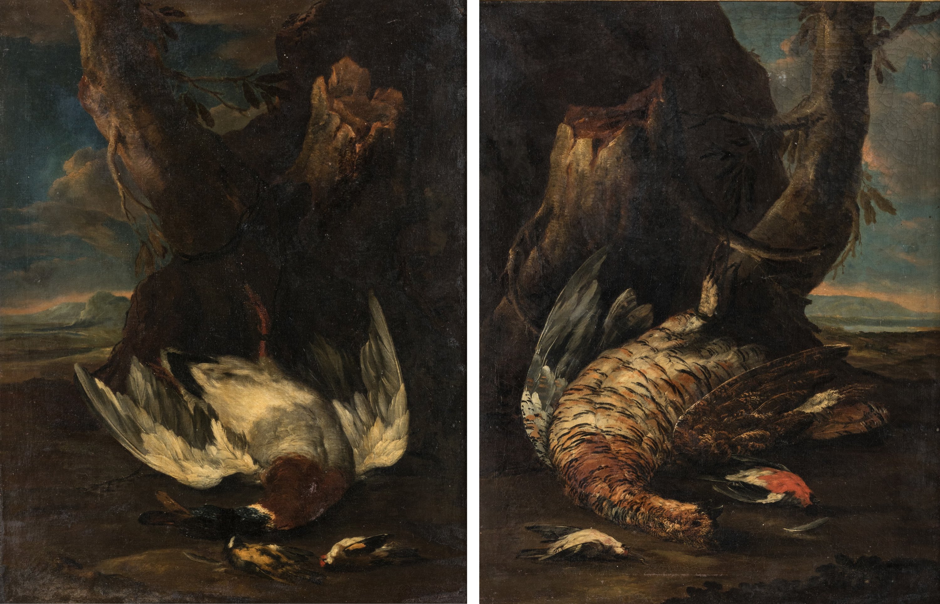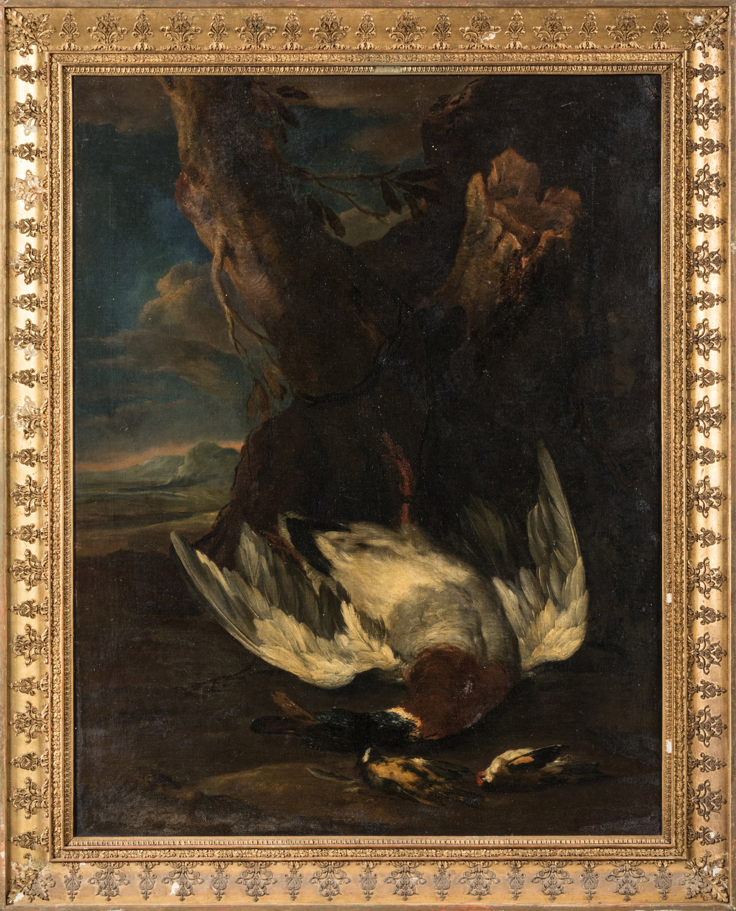 Attributed to Baldassarre de Caro. A pair of still life paintings depicting a bustard and a jay for one and a mallard for the other. In gilded wood and stucco frames.