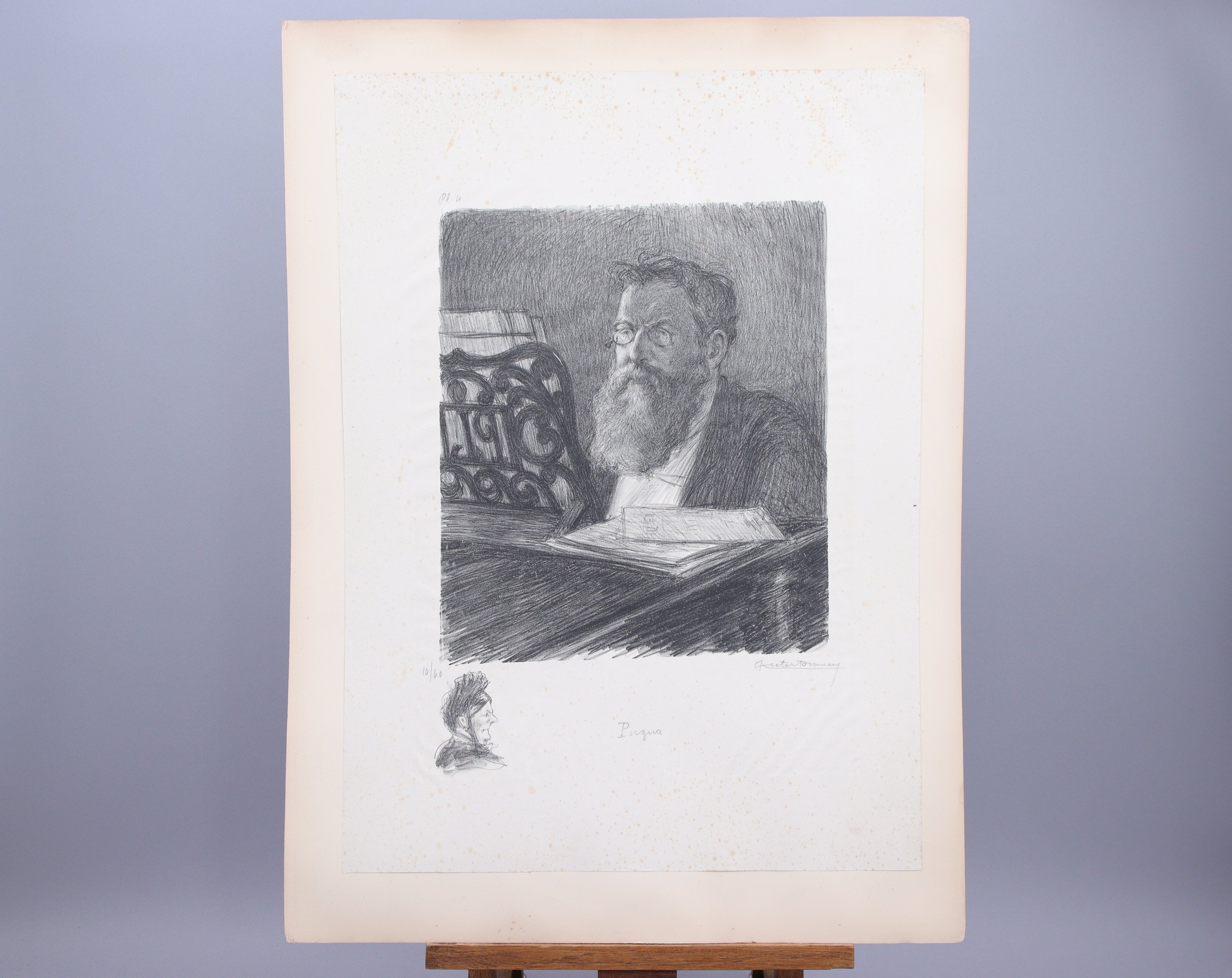 Lithographies en noir sur chine, avec remarque. Chacune porte le numéro de planche en haut à gauche, est signée en bas à droite, titrée, numérotée 10/ 60 et maintenue au verso par une bande de papier brun. Traces de plis ondulés, petites rousseurs éparses. Première page et page de titre numérotée 10/ 60, dernière page, très jaunies avec des mouillures, petits enlèvements en surface, quelques pliures et petites déchirures sur les bords, ainsi que sur les autres pages de supports des lithographies, irrégularités en surface sur les feuillets de support.