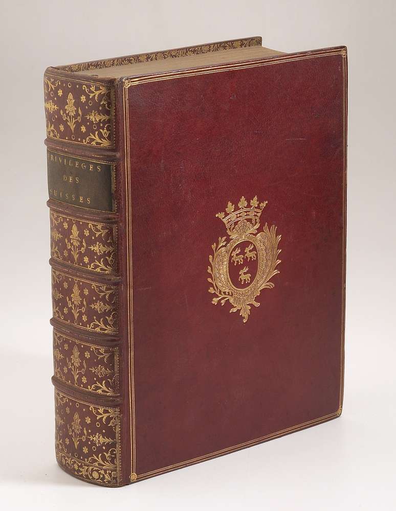 Slnd, (vers 1760). Fort in-4 mar. rouge ép. dos orné, triple filet doré sur les plats armoriés, tr. do. Manuscrit de plus de 600 pp. finement calligraphié. Important travail historique dans lequel on retrouve des informations sur la période 1440-1716 concernant l'enrôlement des soldats suisses en France et les avantages qu'ils en retiraient au sujet du commerce et des exemptions d'impôt. Histoire des corporations, suivie de pièces justificatives. Rel. aux Armes de Trudaine de Montigny. Pièce unique ds une belle reliure.