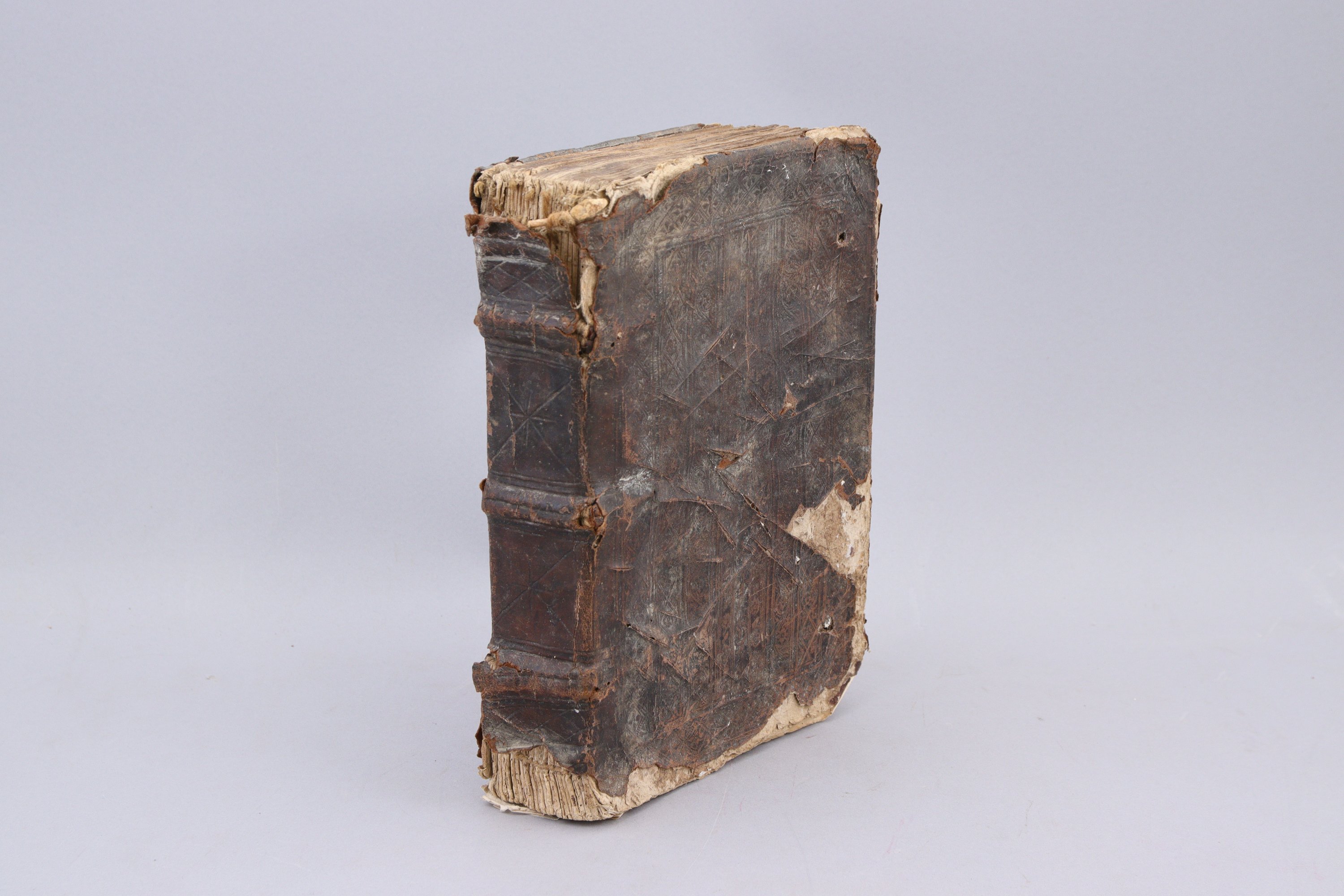 In-4°, (10 ff), 229 feuillets. Vestiges de reliure estampée, traces de lacets. Reliure du temps. (Nerfs rompus ; manques importants à la reliure. Très fortes rousseurs et mouillures dans tout l'ouvrage, avec délitement des marges de queue en fin d'ouvrage., -sans atteinte au texte.. Défauts divers.).