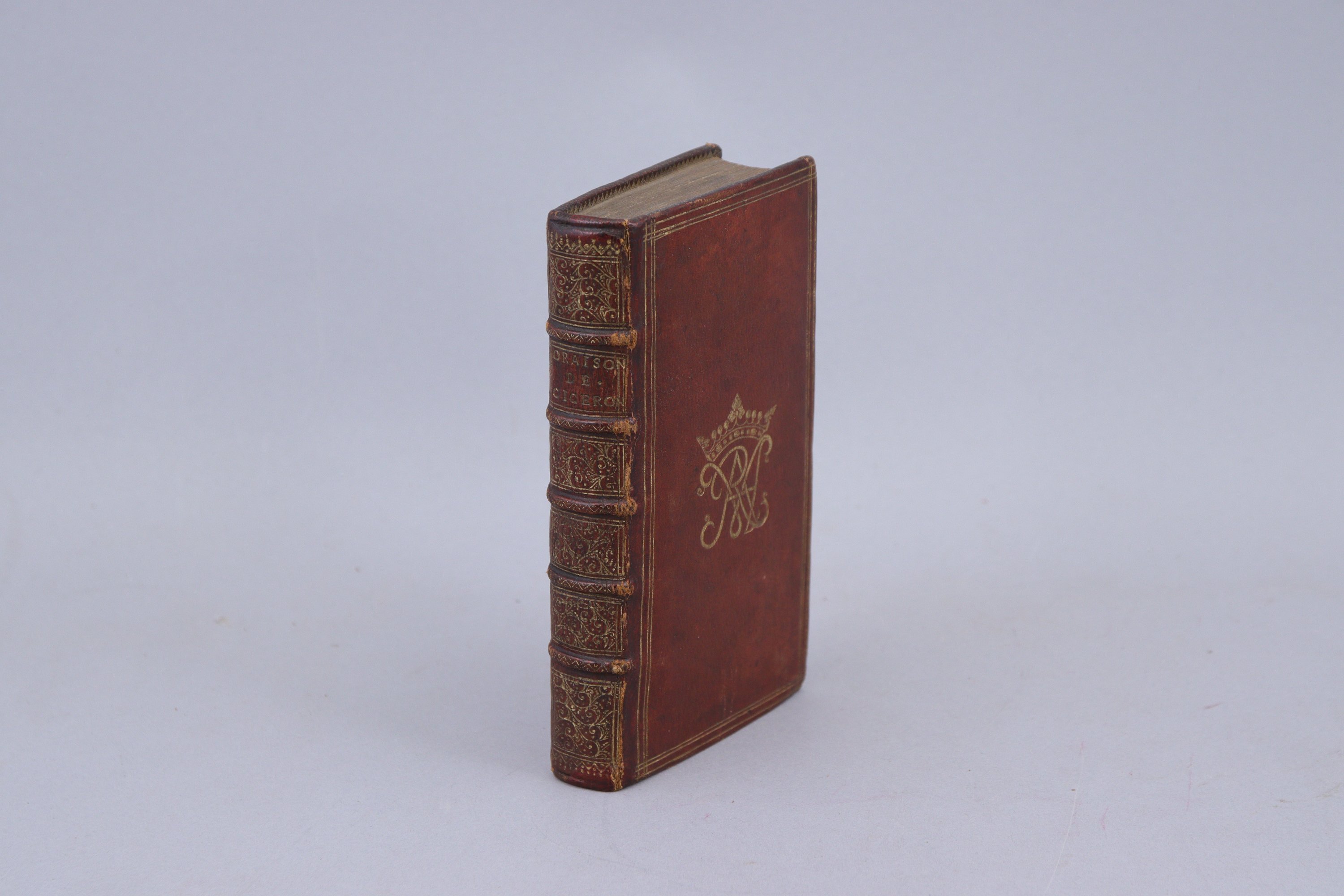 In-12, (2ff), 464 pages. Plein maroquin rouge au chiffre ARVL couronné, triple encadrement de filets dorés, roulette sur les coupes, roulette intérieure. Dos très orné aux petits fers. Toutes tranches dorées. Reliure du début du XVIIIème siècle. .