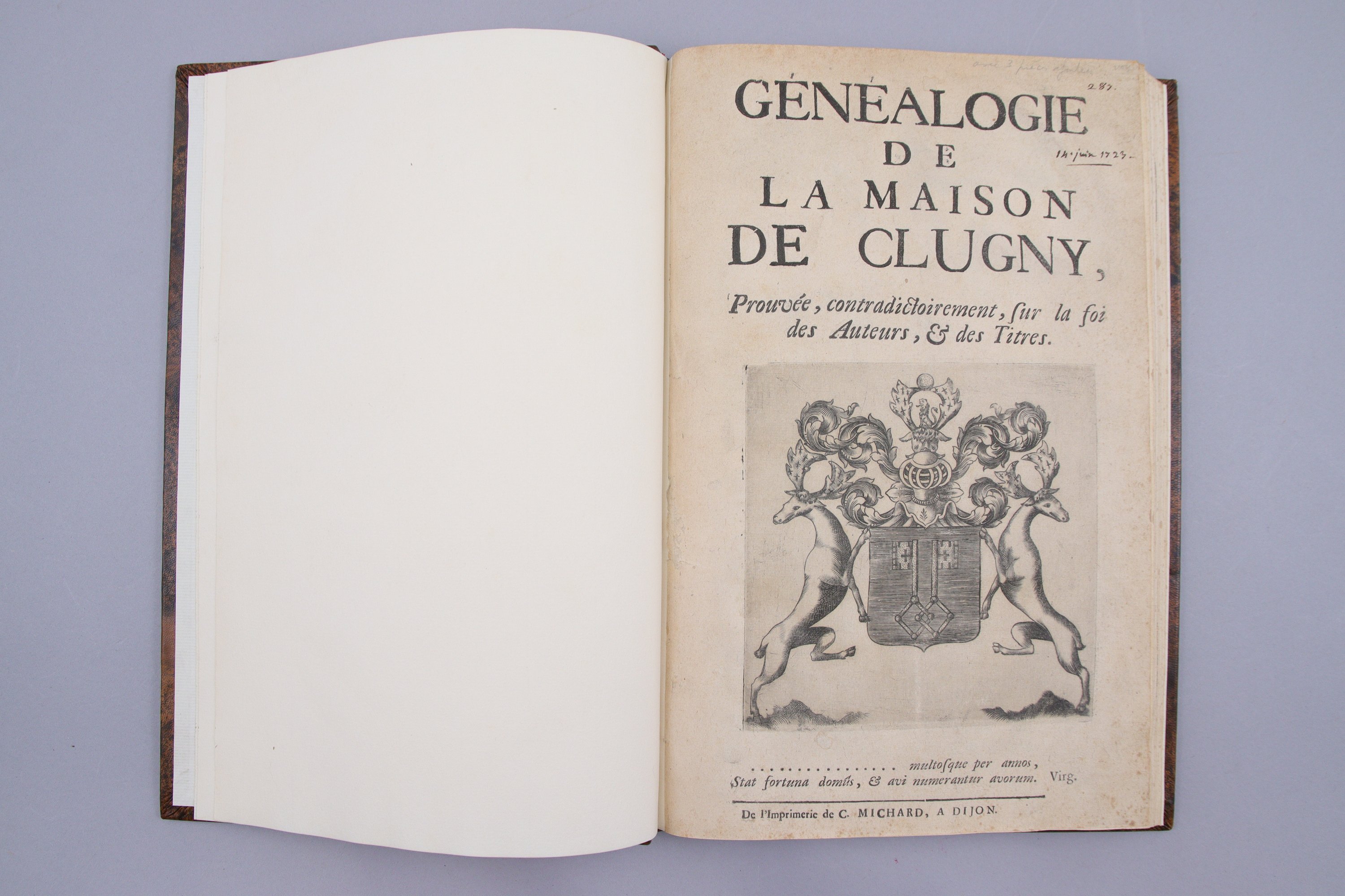 Généalogie de la Maison de Clugny, prouvée contradictoirement sur la foi des auteurs et des titres. Dijon, C. Michard. [Circa 1723]