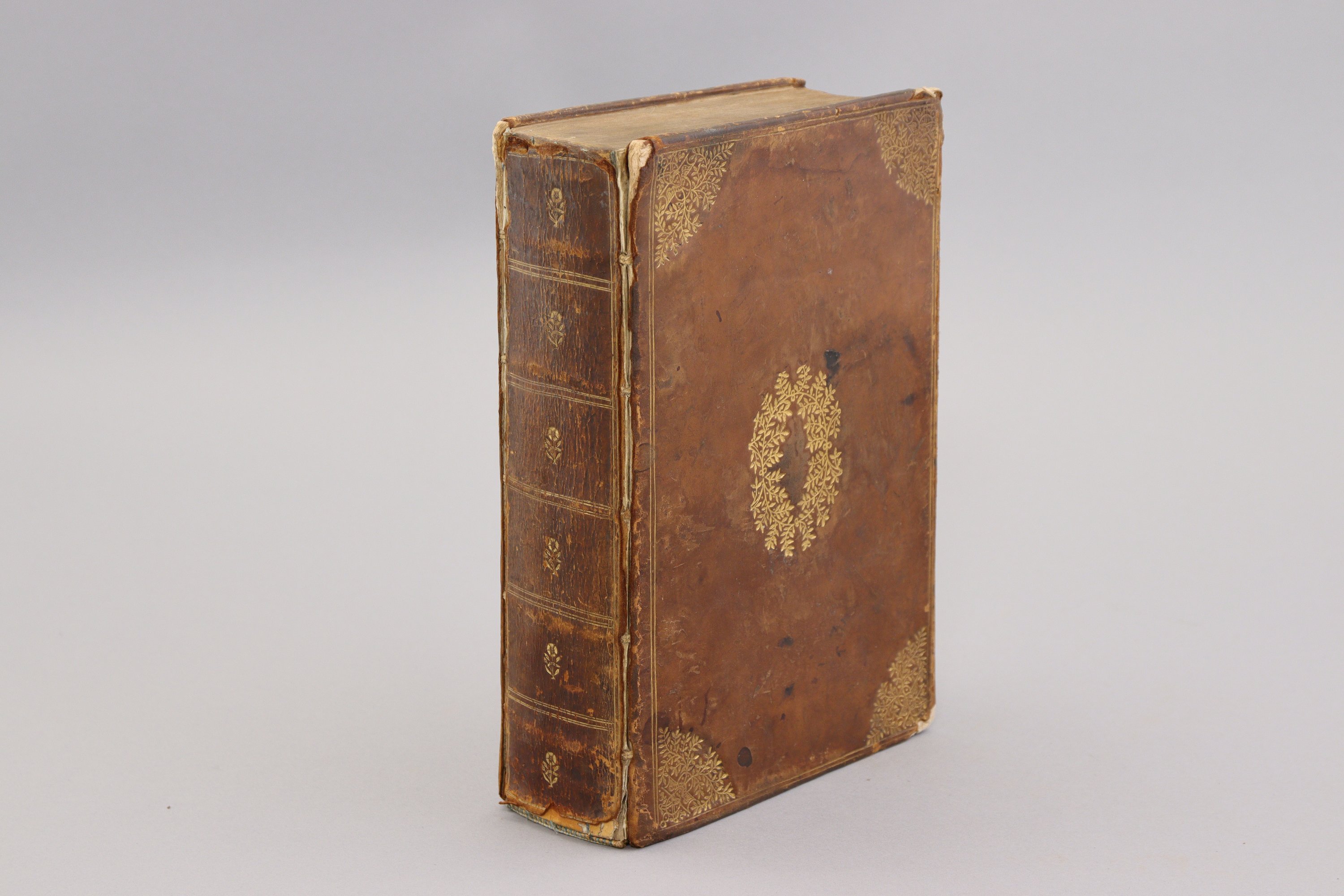 Fort in-4°. Elégant veau fauve du temps, filet double d'encadrement, larges fers dans les angles figurant un visage d'angelot dans une ramure d'olivier ; décor ovale de ramure au centre des plats. Dos sans nerf, probablement refait au XVIIIème siècle. Toutes tranches dorées. (3 ff), 1130 pages, (10 ff). (Coiffes et coins frottés, mors fendus. Manque le portrait).