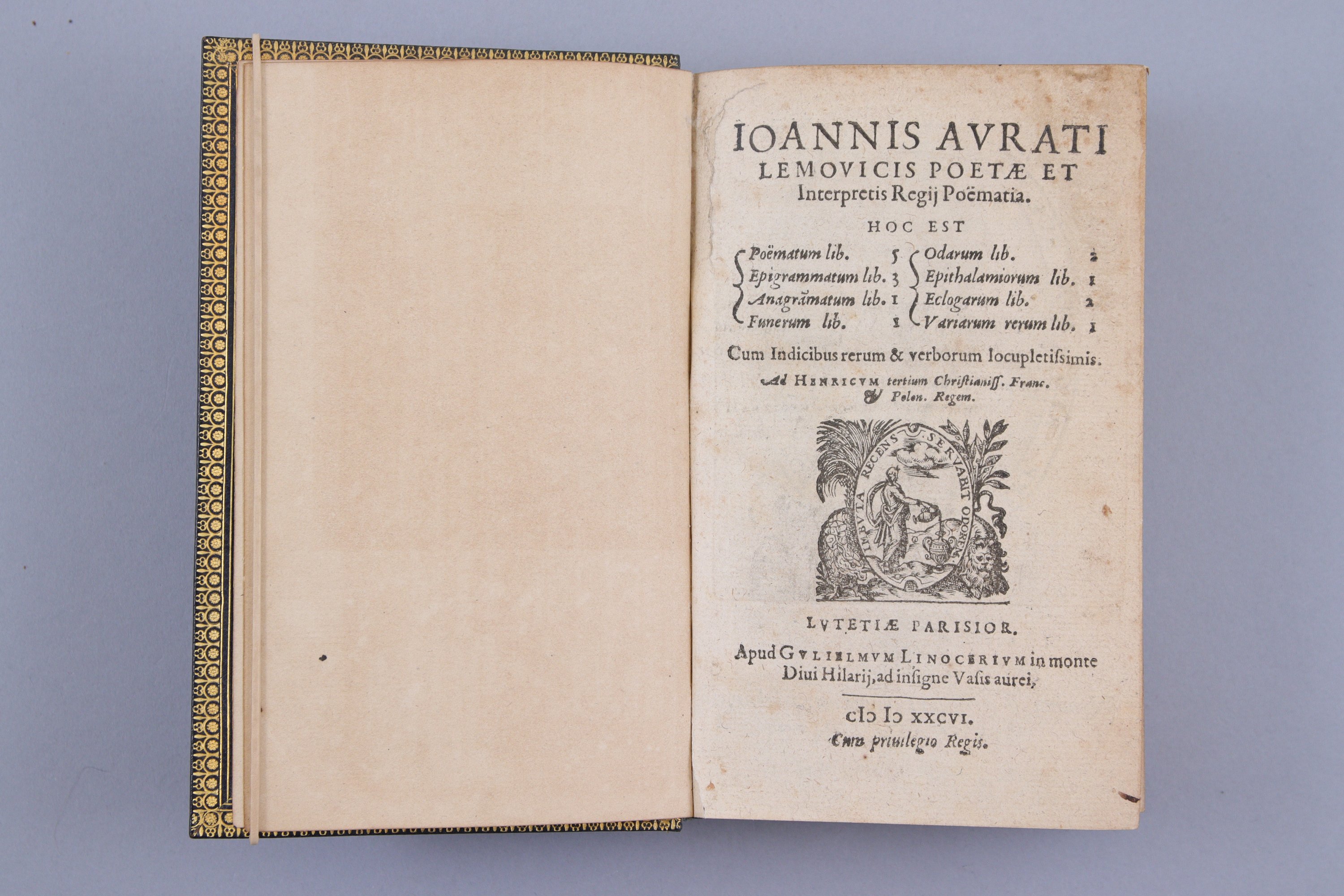 Ioannis Aurati Lemovicis poetae et interpretis Regii Poematia. Hoc est libri Poematum, Epigrammatum, Anagrammatum, Funerum, Odarum, Epithalamiorum, Eclogarum, Variarum rerum.. Paris, Guillaume Linocer. 1586
