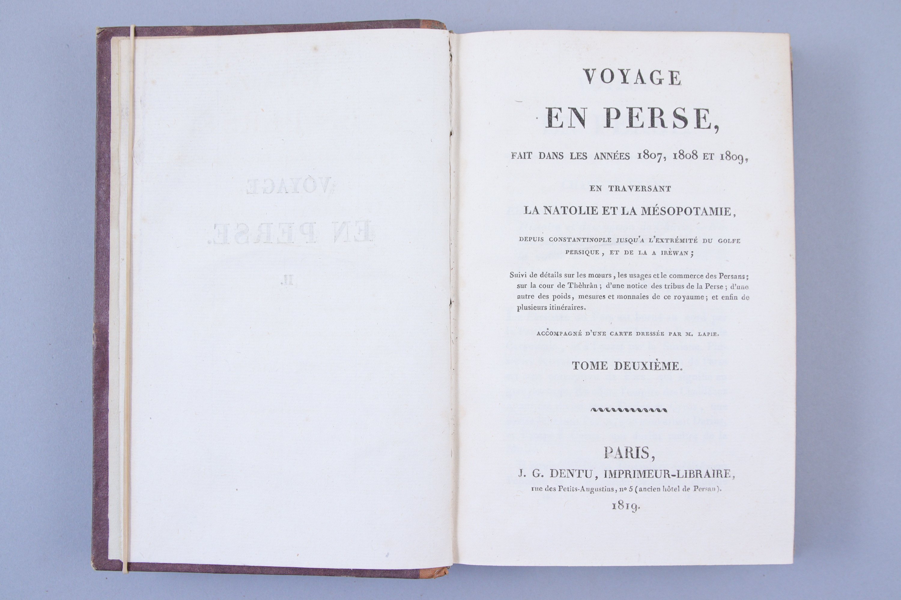 Voyage en Perse fait dans les années 1807, 1808 et 1809 en traversant la Natolie et la Mésopotamie depuis Constantinople jusqu'à l'extrémité du Golfe Persique et de là à Iréwan. Suivi de détails sur les moeurs, les usages et le commerce des Persans, sur la cour de Thérhân ; d'une notice des tribus de la Perse ...accompagné d'une carte dressée par M. Lapie..