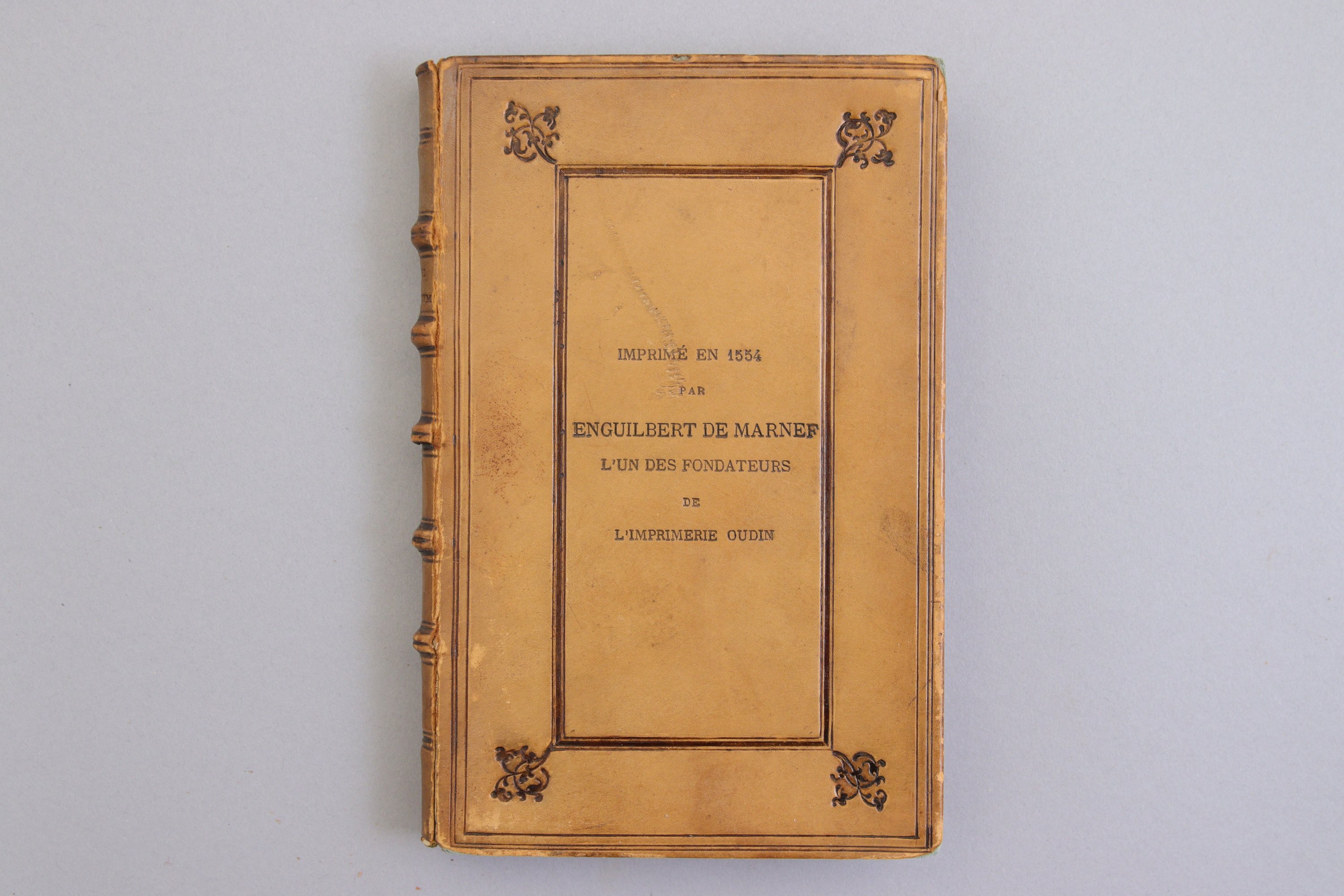 In-8, (16 ff), le dernier blanc ; 202 pages et (3 ff). ¨Plein veau pastiche, avec encadrement et fleurons frappés à froid ; texte au centre du plat supérieur :"Imprimé en 1554 par Enguilbert de Marnef, l'un des fondateurs de l'Imprimerie Oudin"..