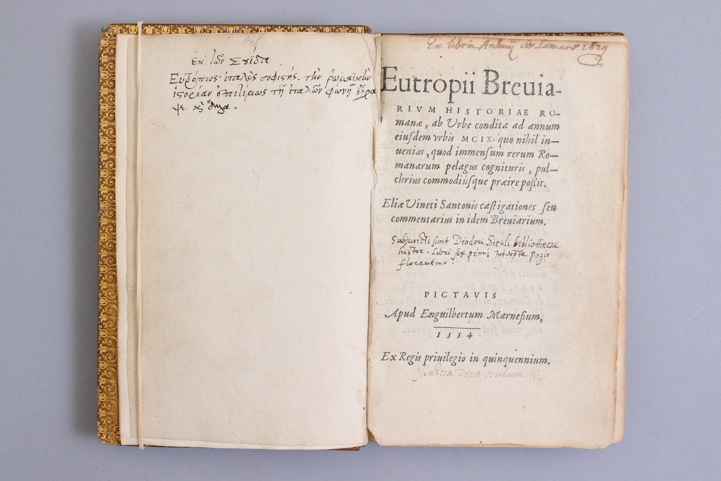 Edition de l'Histoire Romaine d'Eutropius, né à Bordeaux, donnée par l'humaniste saintongeais Elie Vinet, proche de Marguerite d'Angoulème. Belle impression d'Enguilbert de Marnef.
