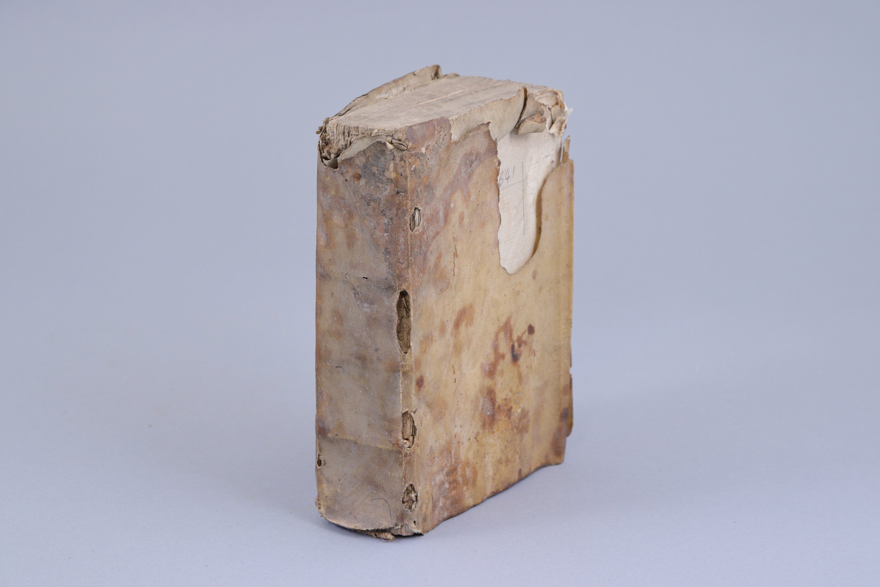 Petit in-4°, vélin souple du temps. (5 ff), 307 feuillets. (Reliure hors d'usage. Très fortes taches brunes -encre?- sur les 12 derniers feuillets. Important travail de vers au fond des cahiers des 5 premiers et des 15 derniers feuillets, n'affectant pas le texte). ).