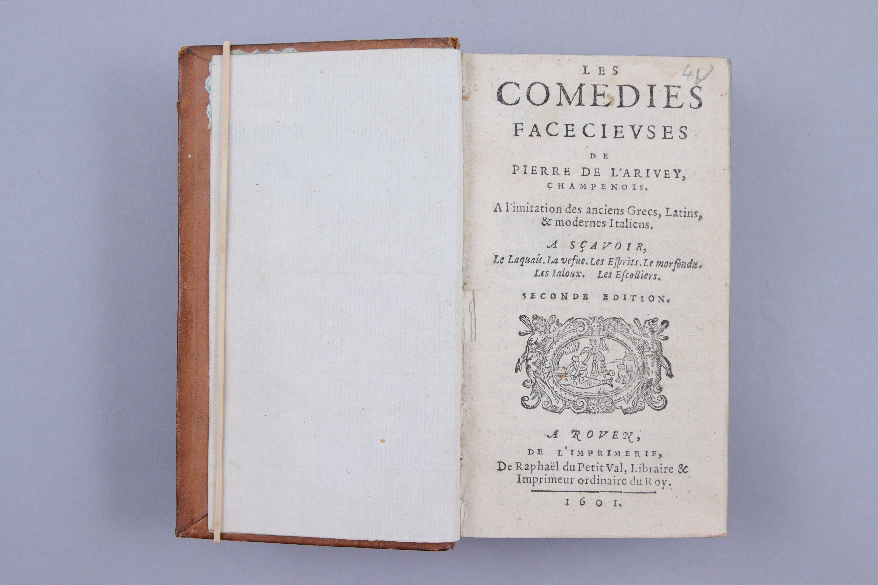 Les comédies facétieuses de Pierre de L'Arivey, Champenois, à l'imitation des anciens grecs, latins et modernes italiens.A sçavoir : Le Laquais, La vefve, Les Esprits, Le Morfondu, Les Jaloux, Les Escolliers. Seconde édition..