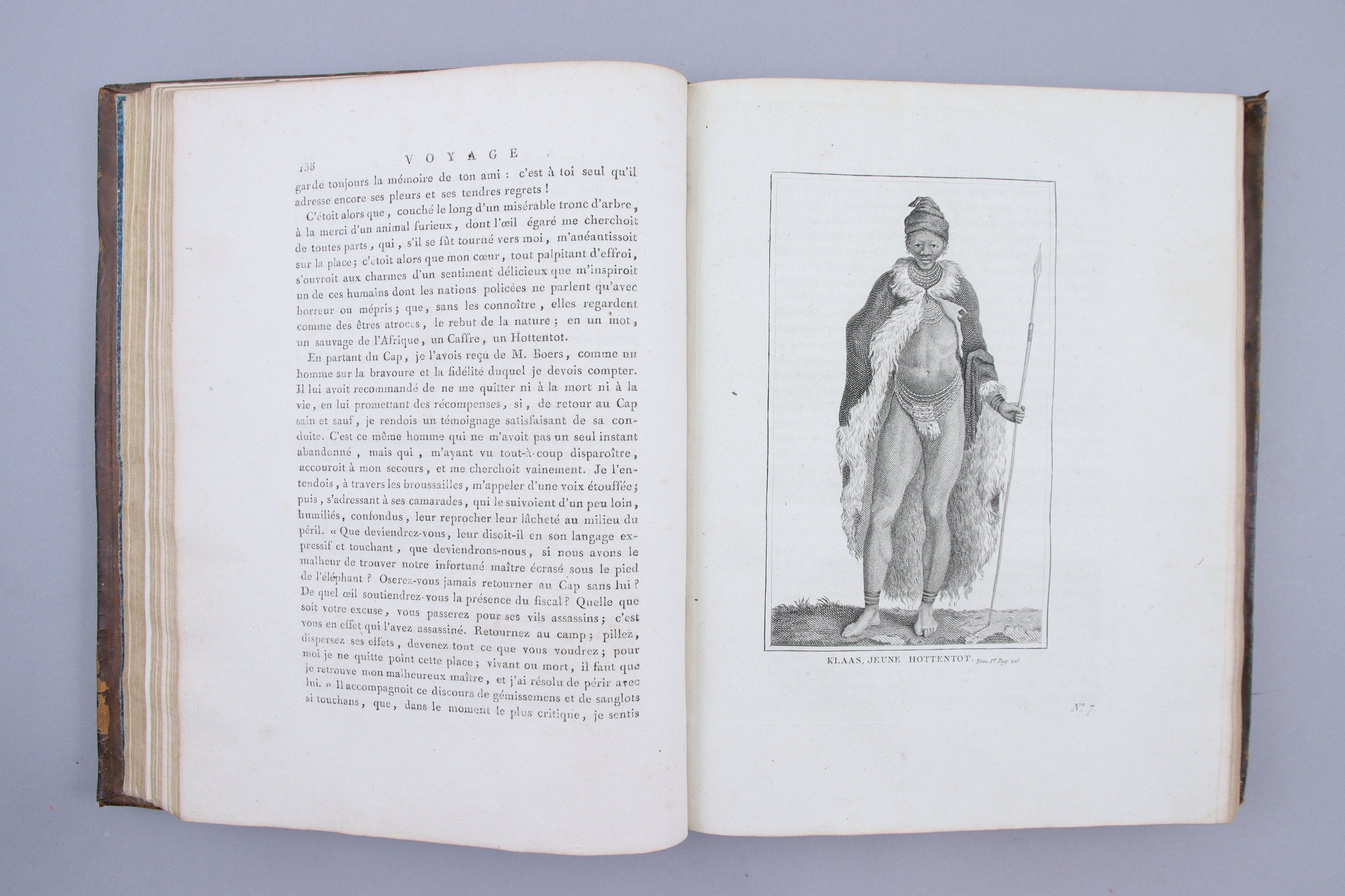 Assez bon exemplaire de ce récit de voyage passionnant, qui connut de nombreuses éditions. Le Vaillant, aventurier, ethnologue, ornithologue (et fournisseur d'oiseaux exotiques divers pour les cabinets de curiosité), est un des personnages les plus romanesques de cette époque qui n’en manquait pas..