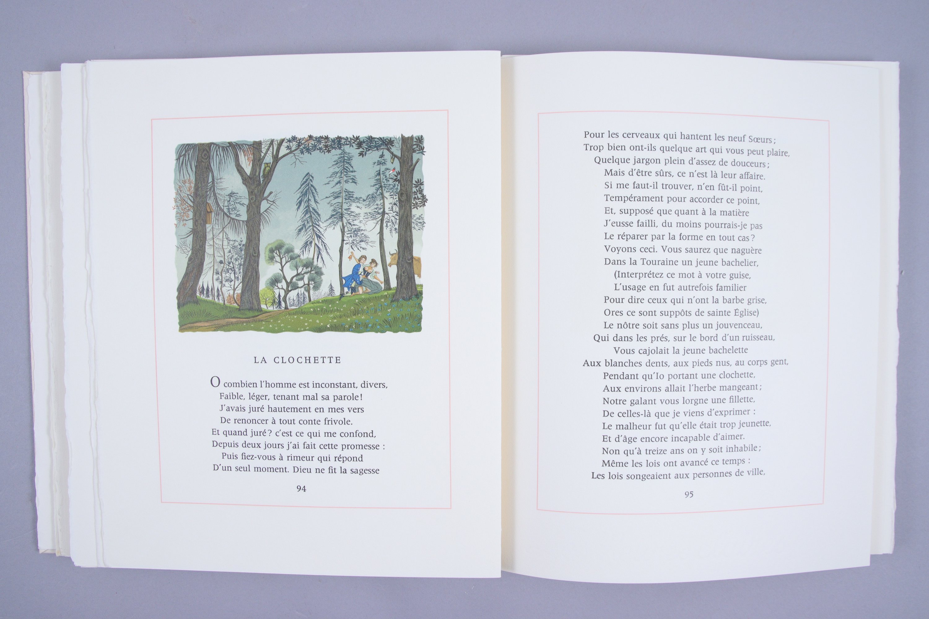 Tome III a : suite en couleurs sur soie ; suite en noir sur soie ; suite en noir sur vélin pur fil ; suite pour la décomposition des couleurs.Tome III b : 3 aquarelles originales ; texte illustré en couleurs ; 3 cuivres encrés originaux.