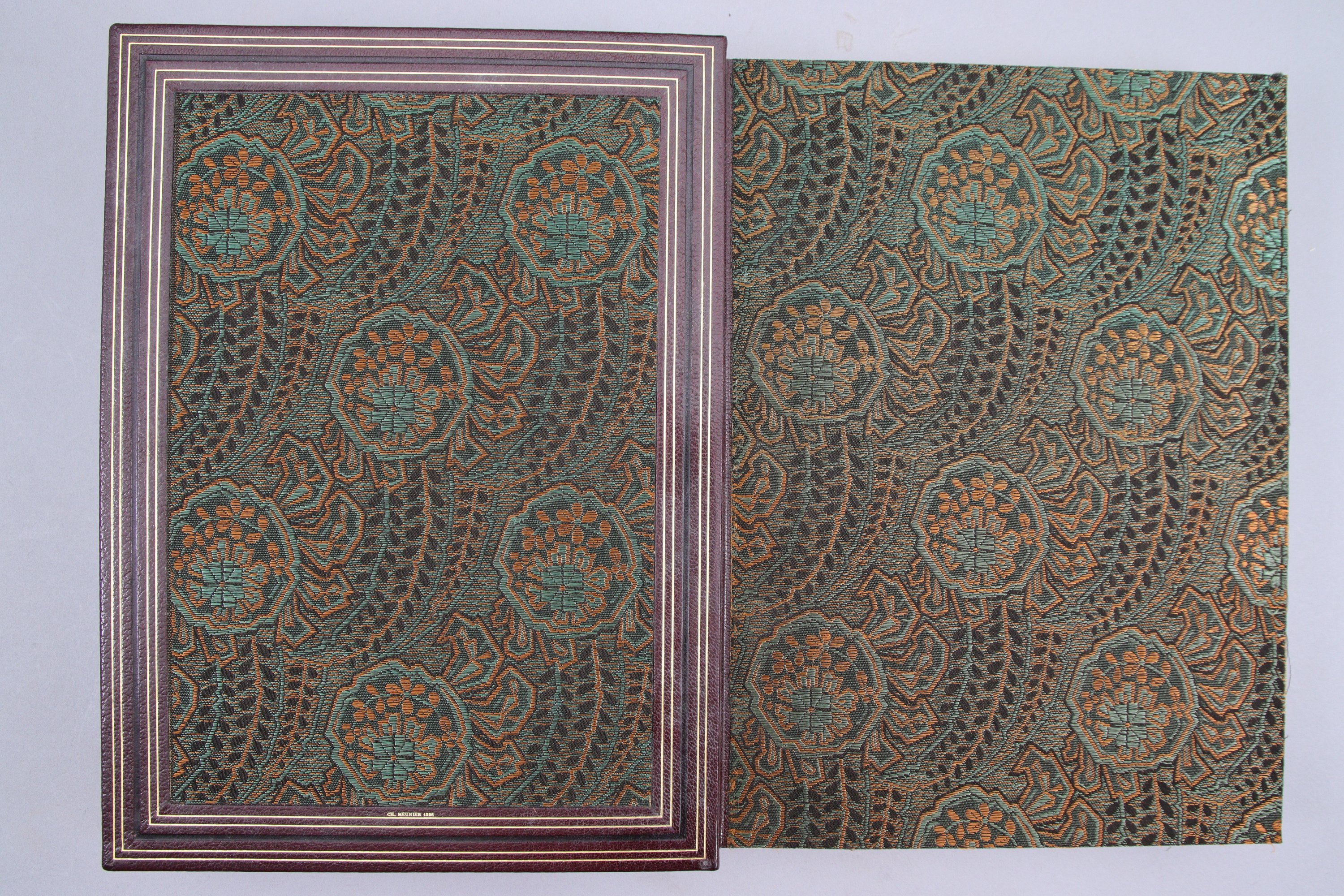 In-4°, plein maroquin janséniste aubergine à gros grains ; large encadrement de maroquin aubergine intérieur, souligné de 5 filets droits dont 1 à froid ; gardes de soie à décor d'indienne, double filet sur les coupes ; toutes tranches dorées. Etui, avec coupes de maroquin et intérieur en feutrine.