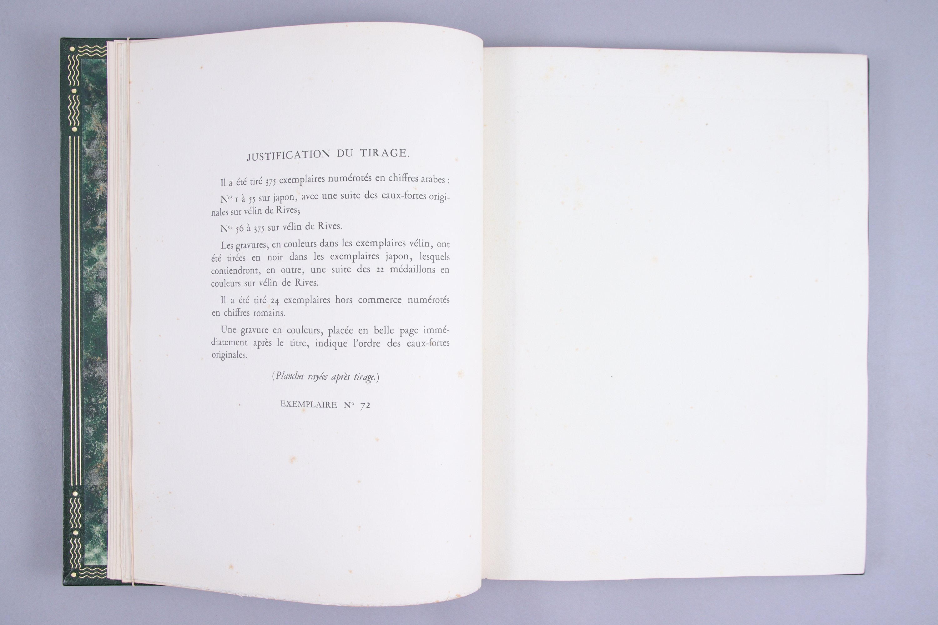 In-folio. Plein maroquin janséniste vert bouteille, à gros grains. Titre en long sur le dos. Bordure intérieure de maroquin , ornée de triples filets droitset de triples filets courbes. Etui bordé de maroquin vert. Couvertures et dos conservés.