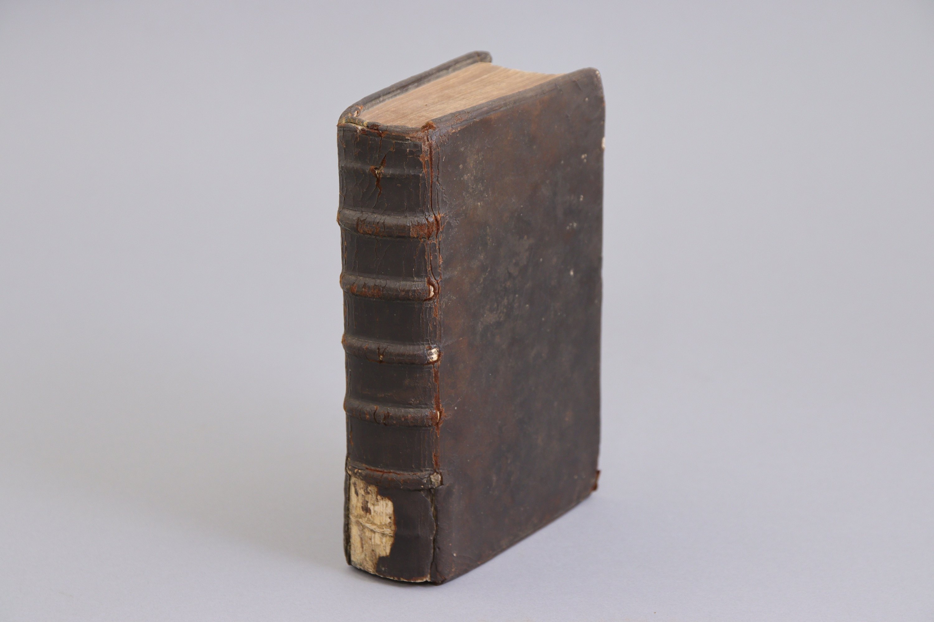 Petit in-4°. Titre en rouge et noir avec portique. 288 feuillets. Au bas du dernier feuillet, registre des cahiers; et au verso, marque d'Antoine Vincent. Plein veau brun, dos muet. Reliure du temps. (Manque le caisson inférieur).