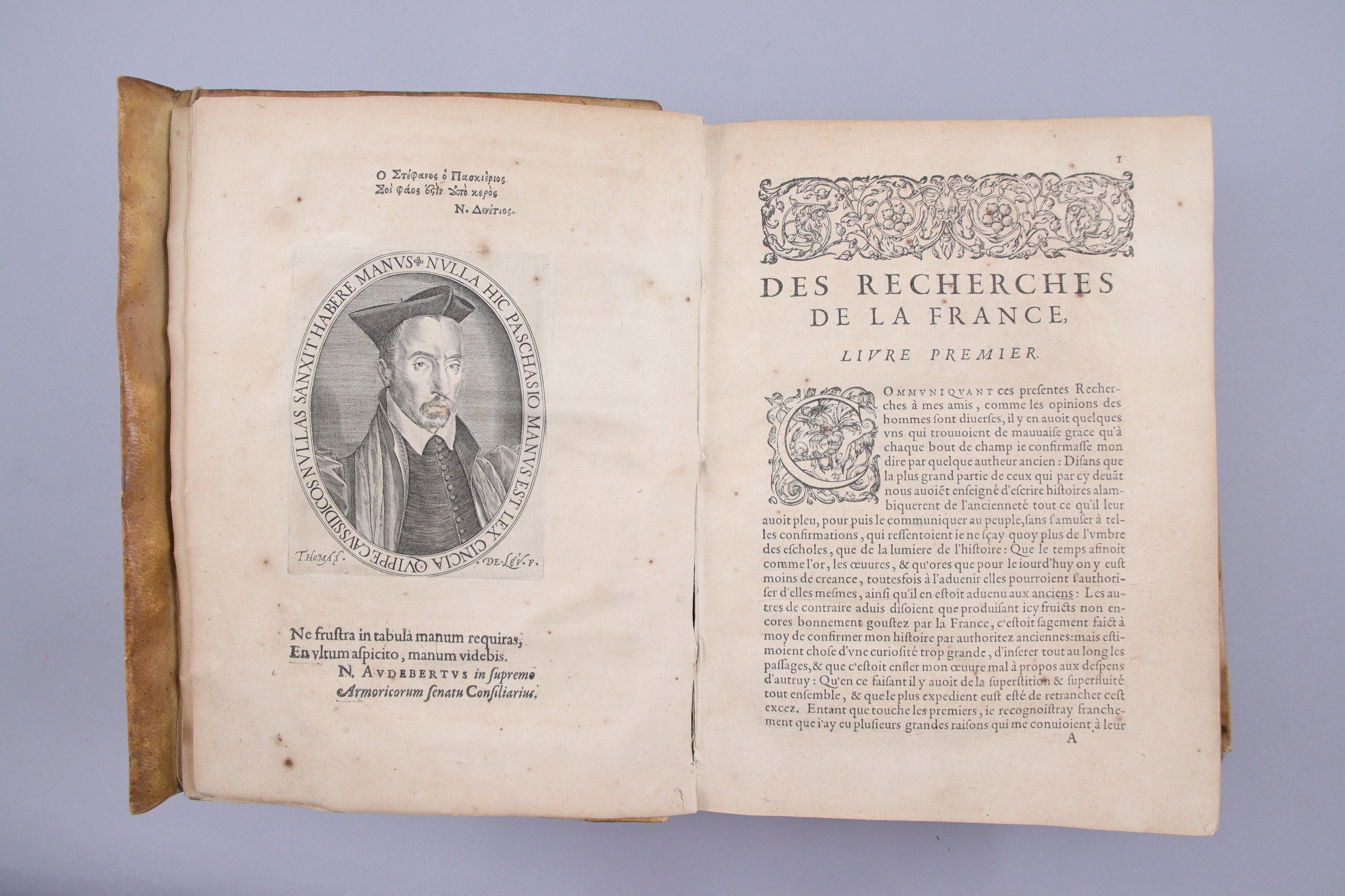 Bon exemplaire, nonobstant les rousseurs, de la dernière édition publiée du vivant de l'auteur, ornée d'un portrait par Thomas de Leu, dans laquelle le Livre VII est en édition riginale. Les livres VI et VII consacrés à l'"Origine de nostre poésie françoise" et à la "Formation de la langue et de l'orthographe françaises", accordent une large place aux écrivains de la Pléiade, dont Pasquier était membre..