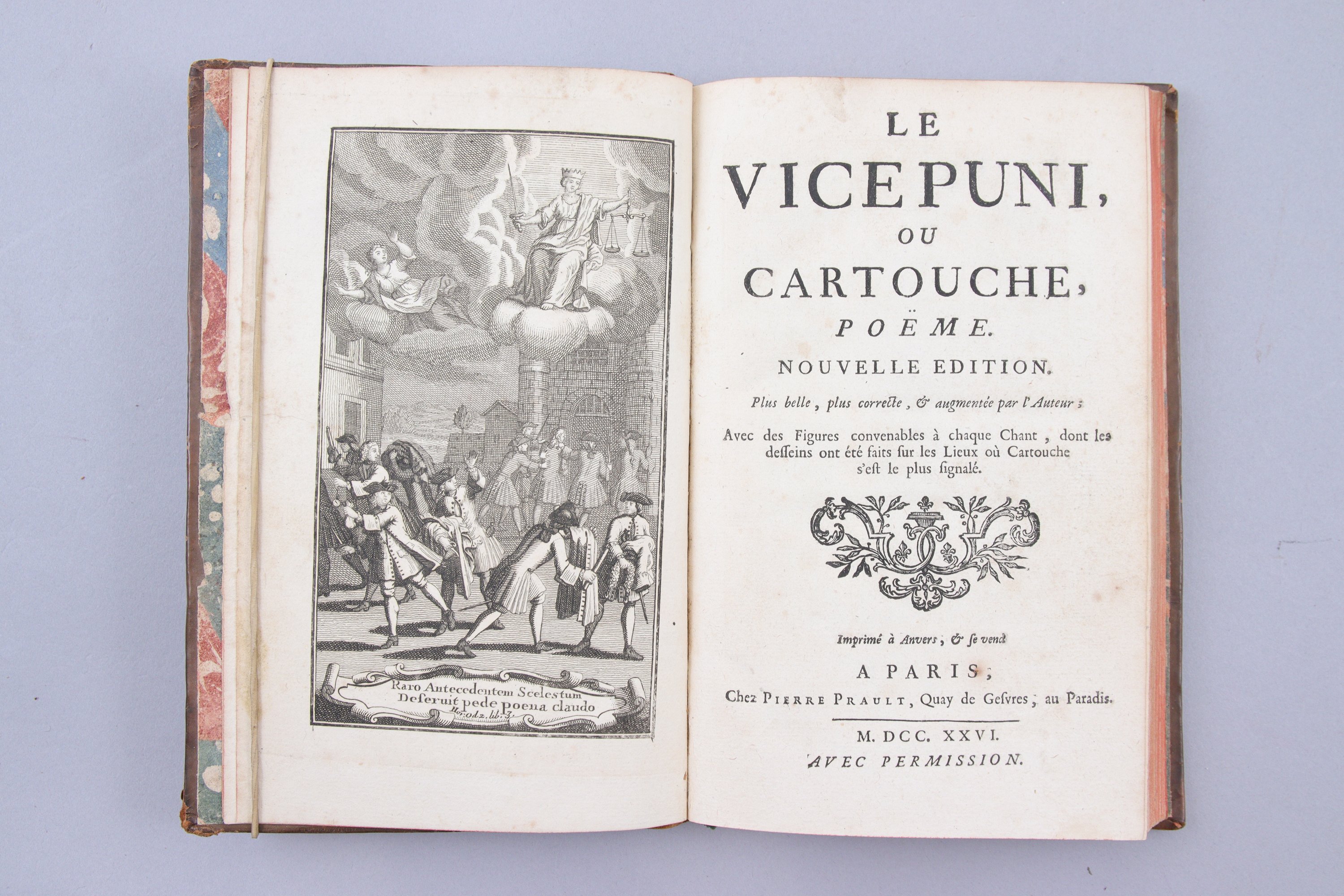 Le vice puni ou Cartouche. Poème. Nouvelle édition. Plus belle, plus correcte et augmentée par l'auteur. Avec des figures convenables à chaque chantn dont les dessins ont été faits sur les lieux où Cartouche s'est le plus signalé.
