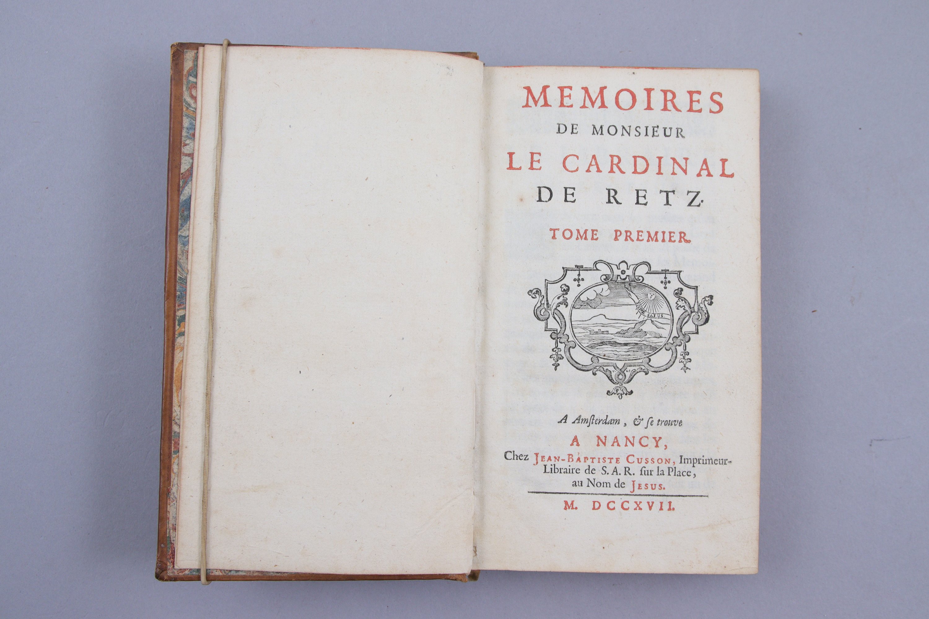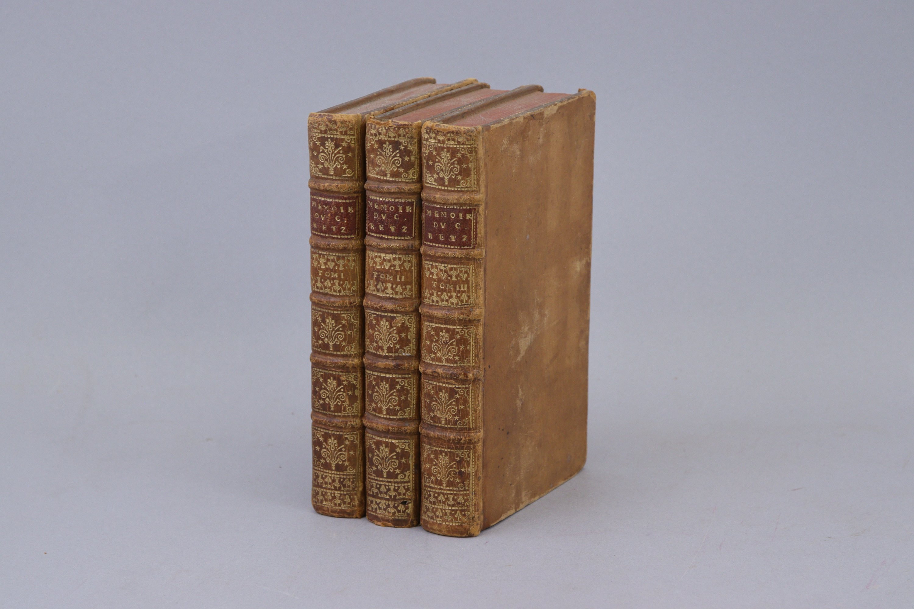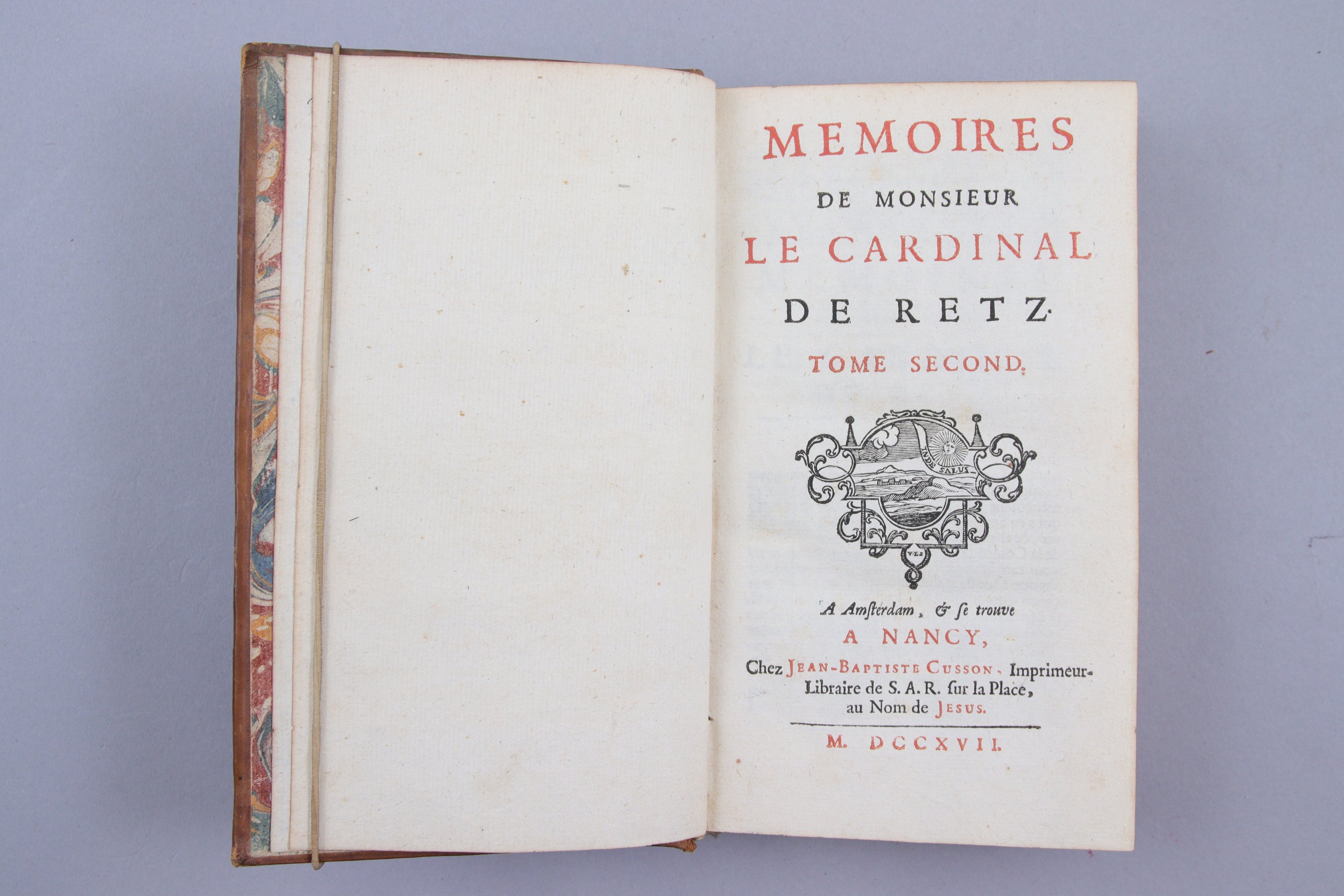 Bon exemplaire de l'édition originale d'un ouvrage recherché, considéré comme un des chefs-d'oeuvre littéraire et historique du XVIIème siècle. Retz y raconte de nombreux épisodes de sa "vie agitée de tant d'aventures différentes", en particulier sa participation à la Fronde pendant la minorité de Louis XIV. Rédigés vers 1675-1677, ces Mémoires, pour des raisons politiques évidentes, ne purent être publiés que 40 ans plus tard -à Nancy.