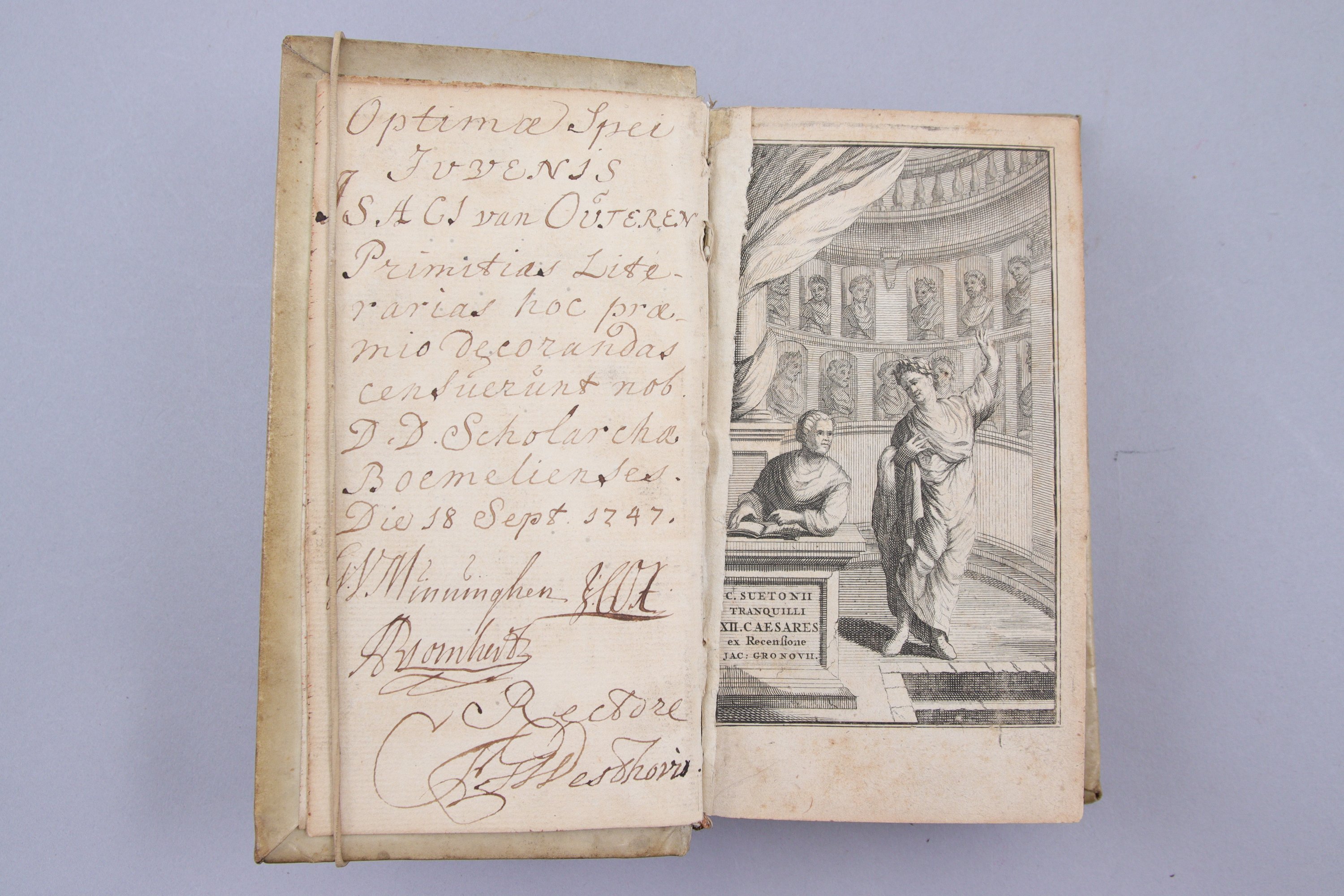 Livre remis en prix en 1745 au Collège de Zaltbommel à l'élève Isaac van Outeren.