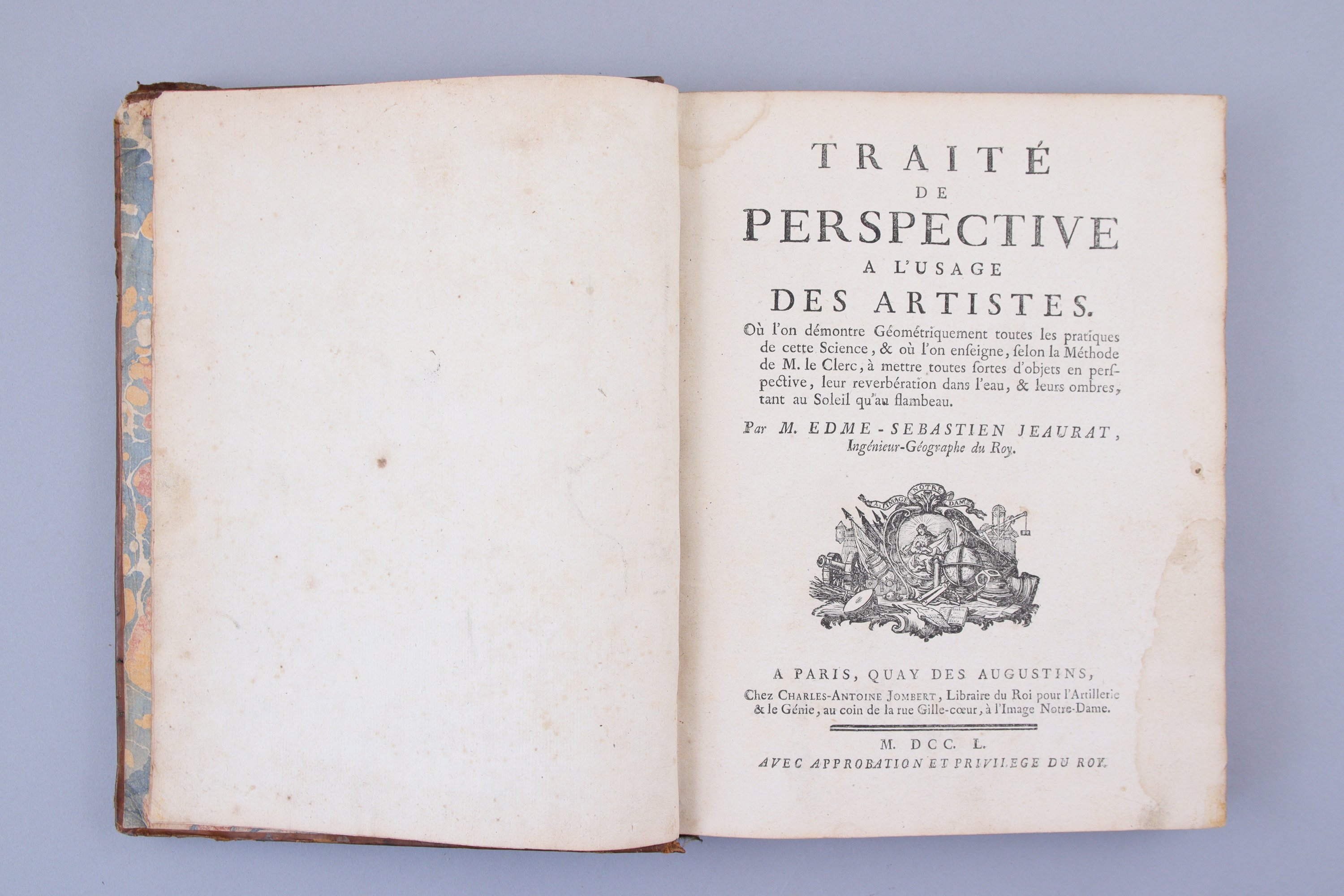 Edme Sébastien Jeaurat, astronome, fils du graveur Edme Jeaurat, petit-fils par sa mère du graveur Sébastien Leclerc, neveu du peintre Etienne Jeaurat, publie en 1750 ce Traité de Perspective, ouvrage qui marqua toute l'école française de peinture de la fin XVIIIème.