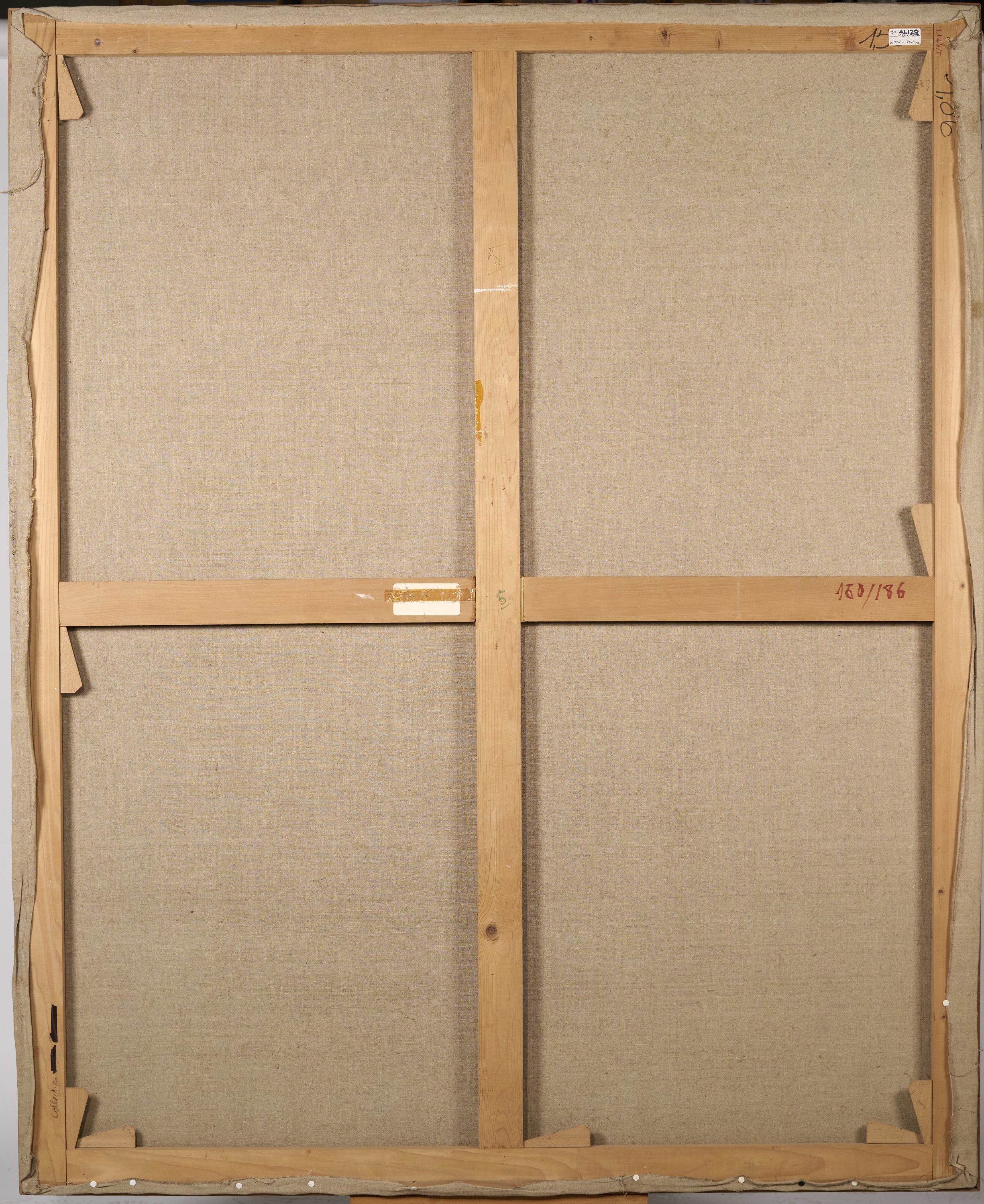 Signée en bas à droite. Étiquette sur le châssis avec le titre et les dimensions.