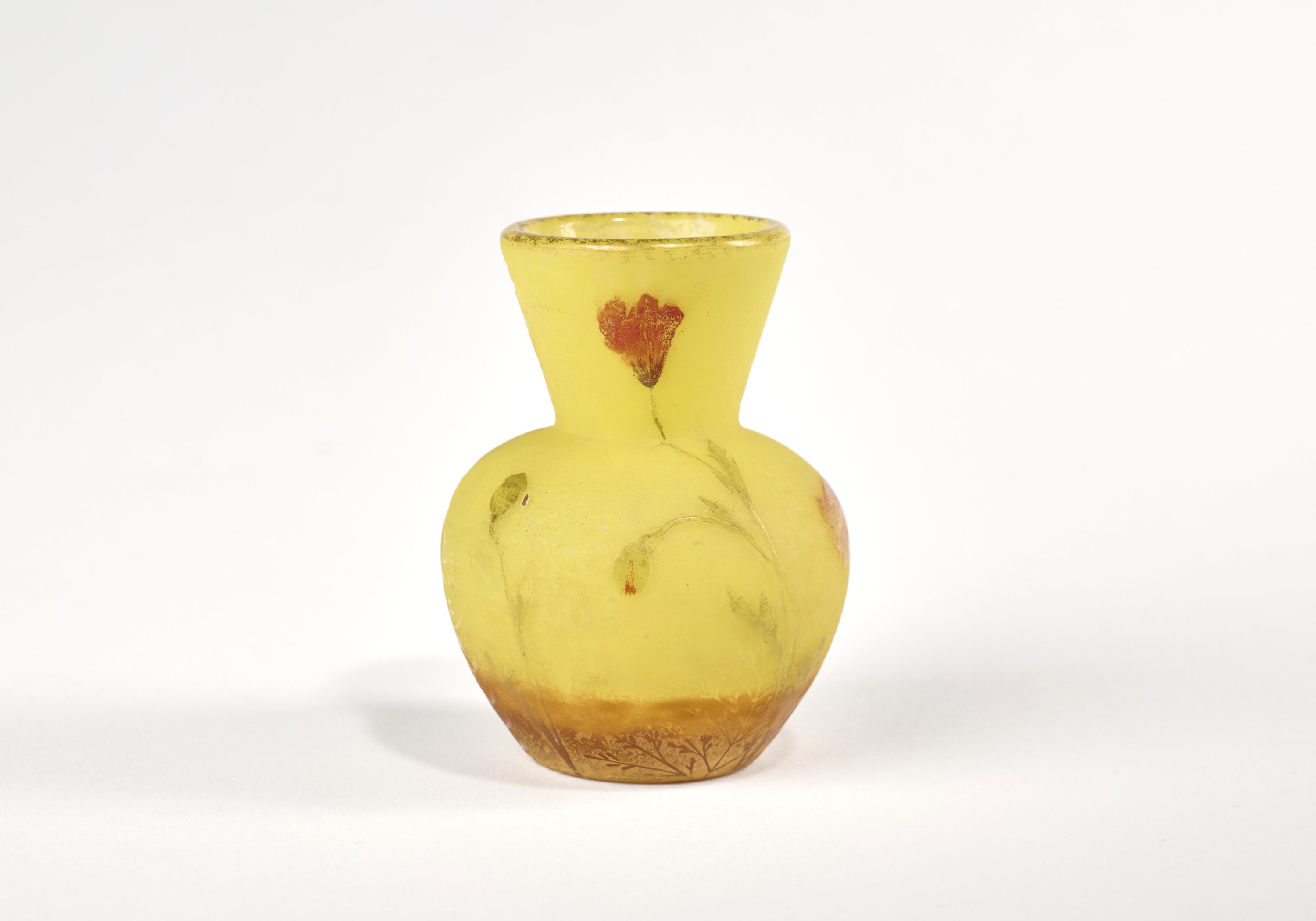 à épaulement renflé et col tronconique. Verre marmoréen jaune et orangé à décor multicouche, gravé à l'acide et émaillé de coquelicots sur fond givré.