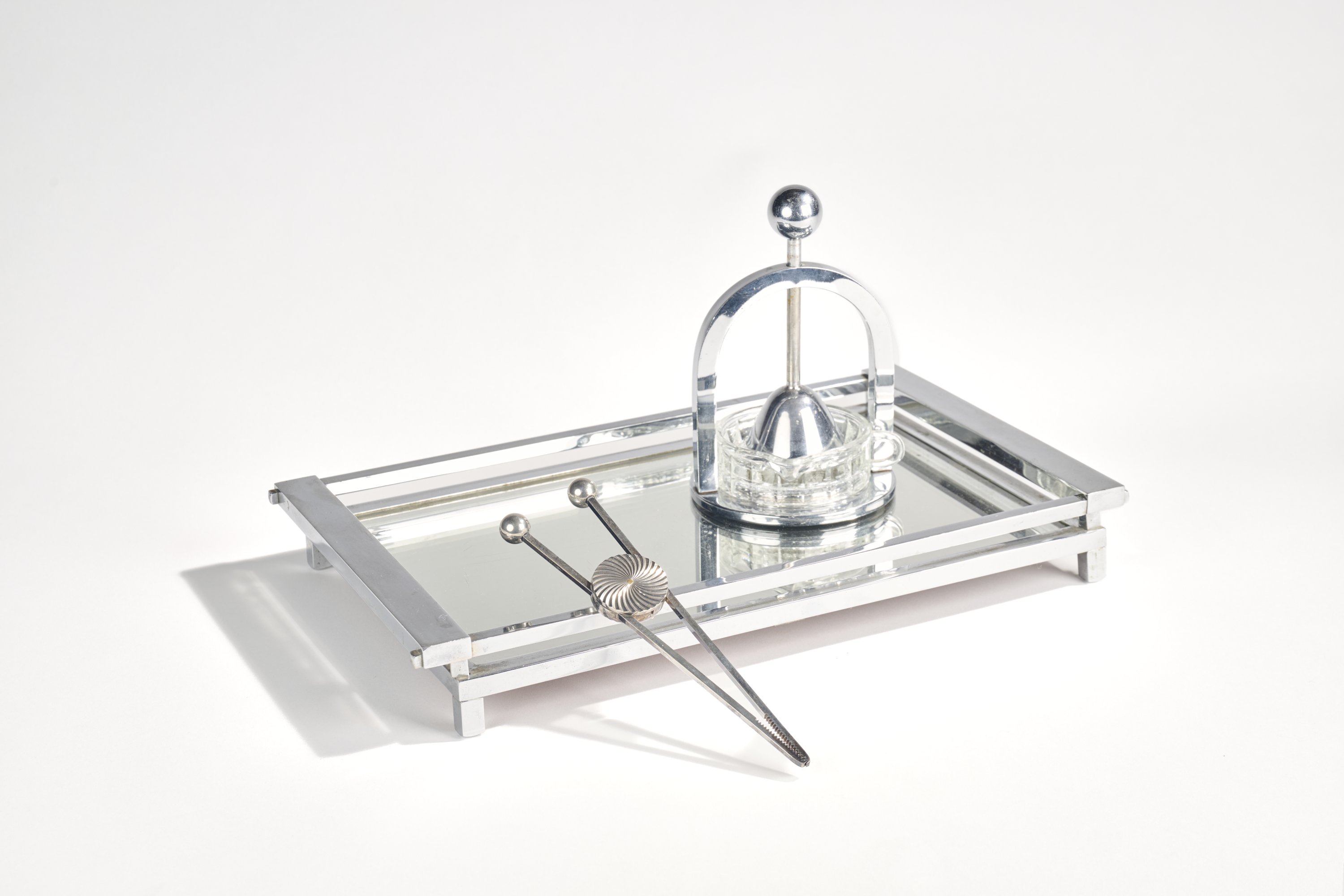 - Le plateau de service rectangulaire en métal chromé et fond ceint d'un miroir. Long. 41 cm (petites rayures).