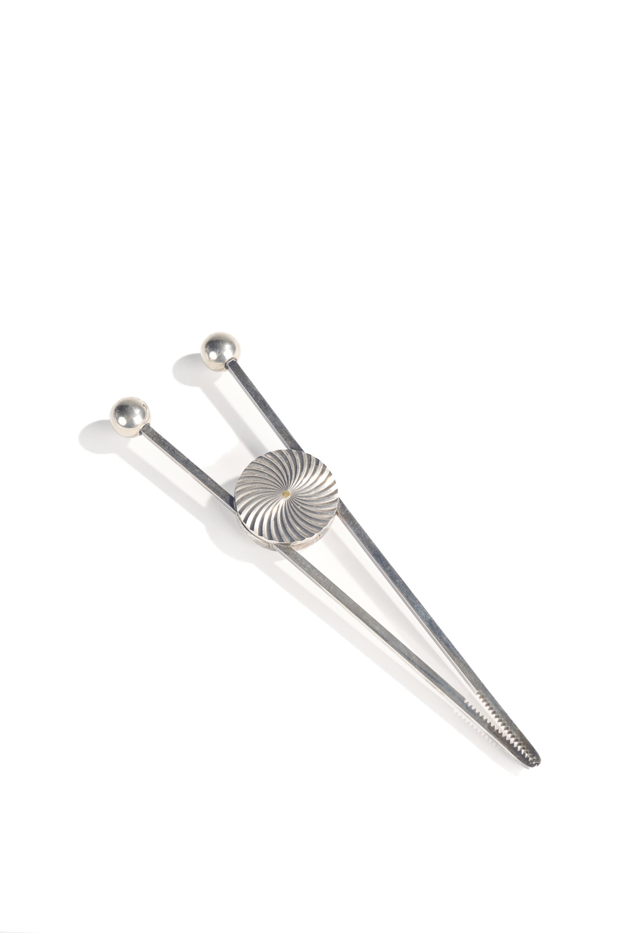 - La pince à sucre terminée par deux boules à décor rayonnant. Long. 20,5 cm.